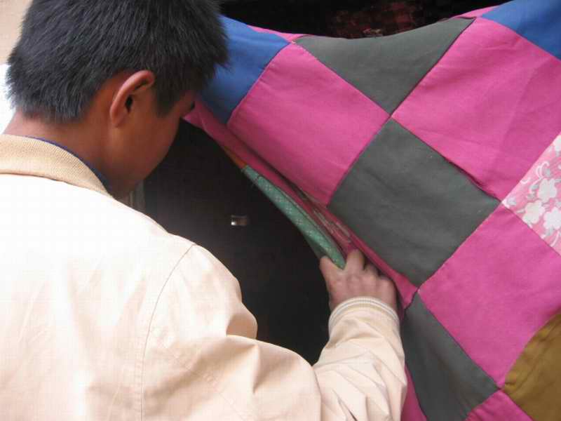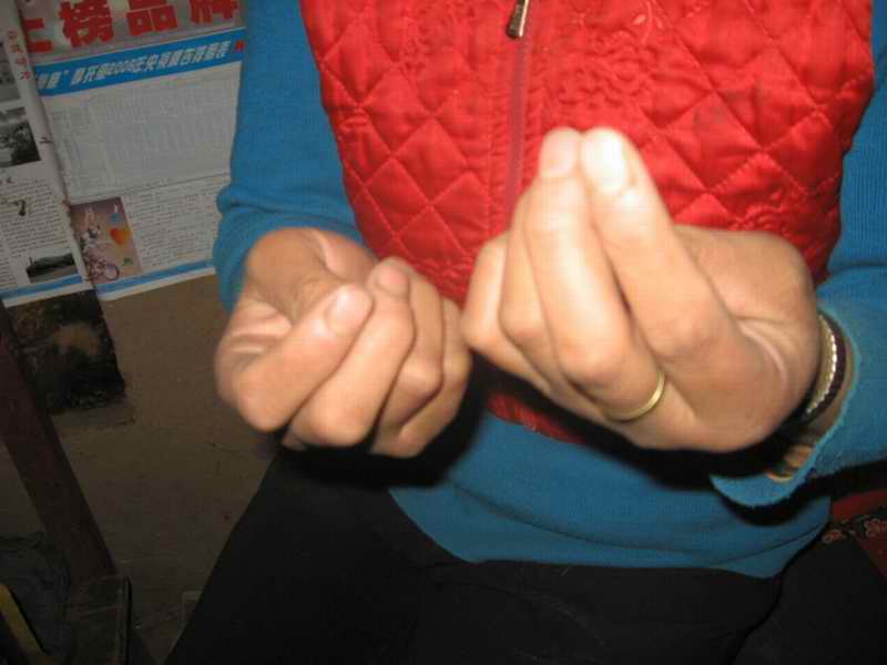 突然听见母亲发出一声"唉呀!",我看见母亲的手被针扎了一下,鲜血流了出来,母亲用另一只手指摁了一会儿,没包扎,只是又开始工作了。