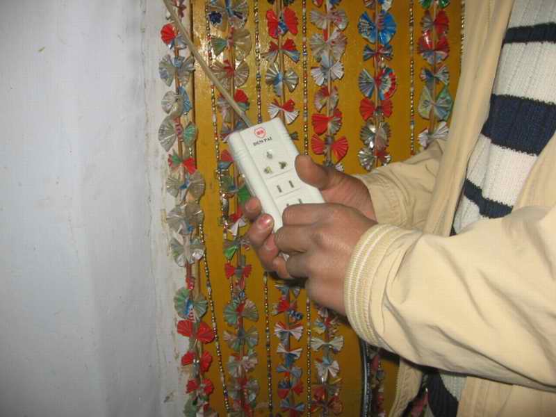 当我正疑惑时,我看到了墙上的工具袋。那是爸爸的用电家伙。平时,我看爸爸摸这摸那的,但爸爸总是不让我玩,说有危险,现在爸爸不在,我便拿出一个电笔来,一手拿锅的插头,一手拿电笔用力地转了起来。