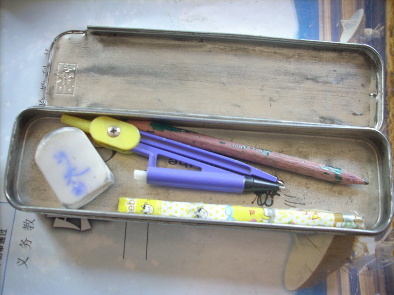 它们安静地"躺"着,一点声音也没有,好像正在酣睡在文具盒 内。下层里边有尺子、小刀、转笔刀。虽然这些成员不少,但还是挺和谐的呢!