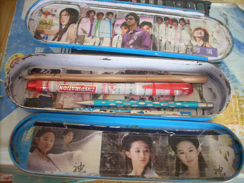 文具盒不但盒盖上图画美丽,而且里面也别新样。轻轻打开盒盖,就会发现居住在盒里的成员还不少呢!盒内分上下两层,上面是钢笔、香水铅笔。