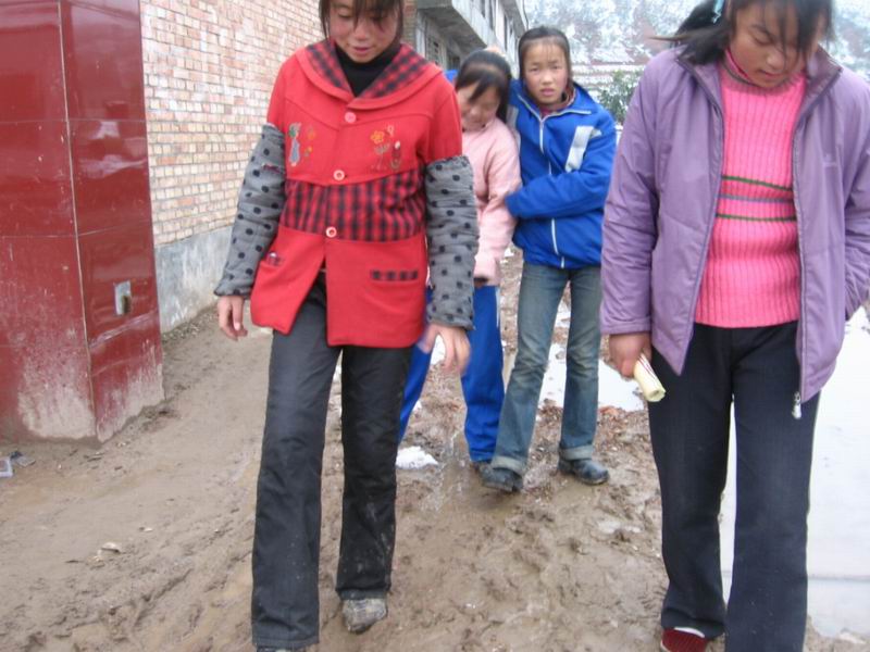 在泥泞的道路上,伙伴们都小心翼翼地走着,生怕摔跤。而我连蹦带跳地跑在前面。有的伙伴把我拉到她们后面,我拼命地向前面跑。同学们拼命的拉着我。