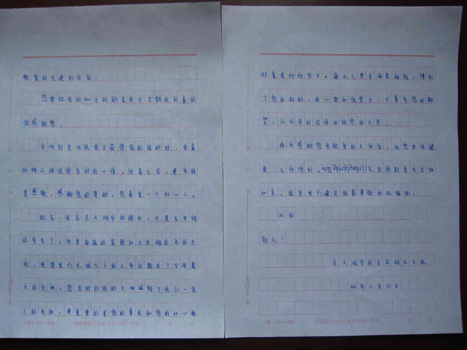 现在,我在东大滩学校读书,已是五年级的学生了。但是家庭的贫困加上庄稼连年的欠收,使得我们兄妹几人的上学问题成了父母最大的负担,您及时的捐助不但减轻了我们一家人的负担,更重要的是您的善良和您的好心激励着我好好学习,滴水之恩当涌泉相报。得到了您的救助,我一定加倍努力,不辜负您的期望,以优异的成绩回报您的大恩。