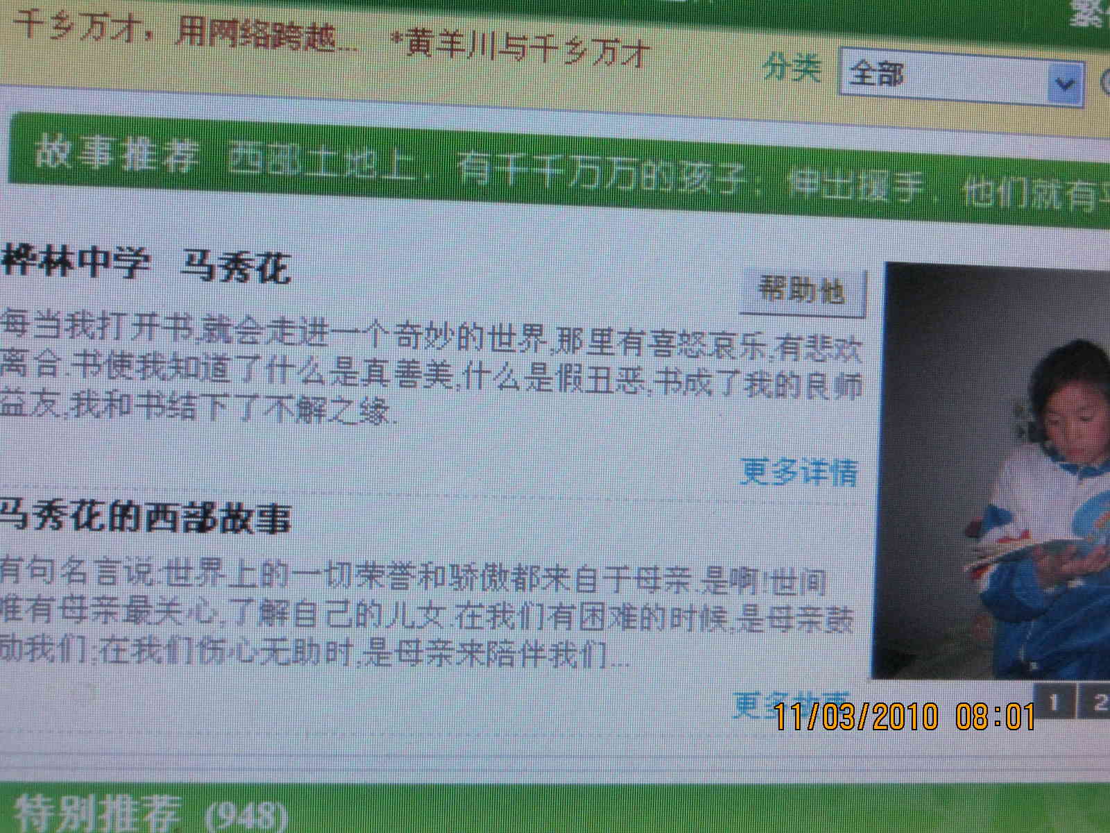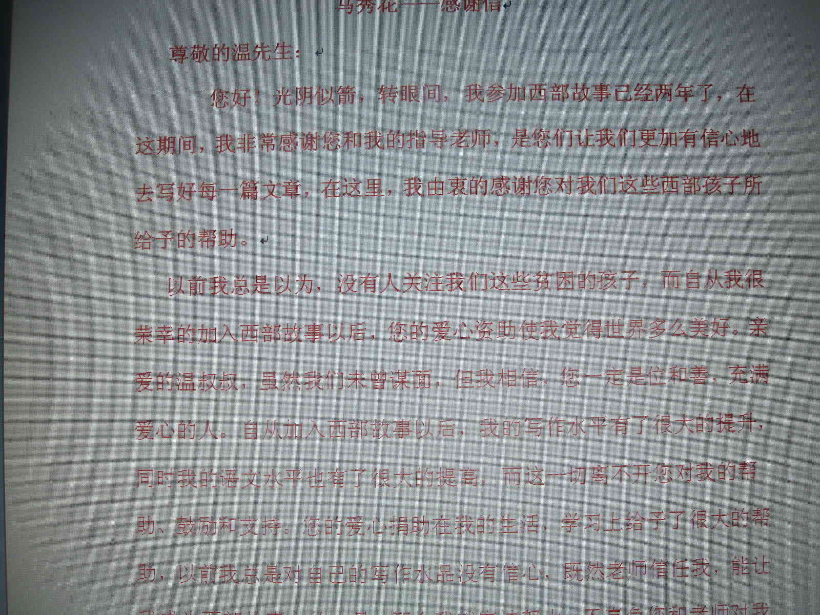 感谢你,西部故事,因为有你,我每学期都得到了四百元的爱心资助,这给我的学习和生活带来了很大的帮助,同时也让我感受到,我们并不孤单,有很多爱心人士在关注着我们这些西部孩子,世界多么的美好。感谢你,西部故事!