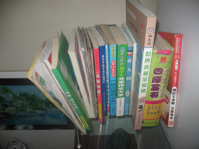 在我写字台的下方是一个方柜子,我用它来放书,不过除了我的课本外,课外书却没有几本。表面上看那些书放得杂乱无章、凌乱不堪,但是我这样放自有我的道理。书角放着一个用玻璃制成的礼物,上面写着"拼搏"二字,在我换书、取书时激励着我。
