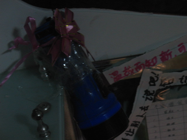 在小天地的正上方,有一根支撑玻璃的木块,上面的玻璃早已打碎了。在这块木头的上方,用胶带粘住的是小手电筒,它就是我的自做的小台灯。它是一个蓝色的、小巧的、实用的小手电筒,是因为以前学校离家远,上学时走路天太黑,爸爸给我买的。现在我家经过搬迁,离学校很近,所以我把它简单的改造了一下,就成现在这个样子了。别看它样子不怎样,用途可大了。有了它晚上写作业就不用开大灯了,这样既不影响别人休息,又节能省电。