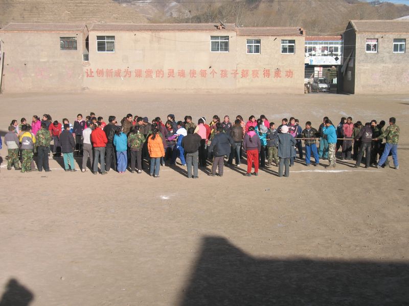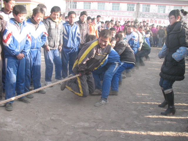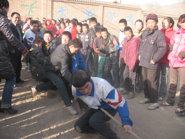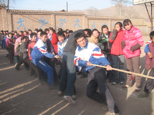 "嘀",哨声一响,两方人员都进入了"战斗"状态,大家使劲的拽着绳子,绷得脖子里的筋都起来了,各班拉拉队也不示弱,扯开嗓门喊:"加油,加油……",只见中心的红绳在中线上左右摇摆,我们都紧紧地盯着红绳的移动方向。终于,我方队员齐心协力,奋力拼搏,绳子的红绸挪到我们班的地界了,"我们赢了,我们赢了……"顿时,操场一片欢呼声,我们班第一局领先。