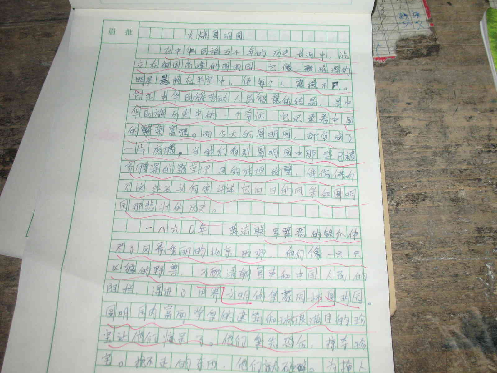 自从参加"西部故事"后,就截然不同了。每次写作文,心里就有了着落。没经过多长时间的思考,拿起笔,总觉得有写不完的话,很快不到一个小时,一篇作文就呼之欲出,呈现在眼前。效率倍增。老师的评语证实了这一点。事情是这样的:我们的语文老师为了检验我们的作文水平,要求写篇以"火烧圆明园"为题的命题作文,还说,下课就收。当一些同学在苦死冥想时,我已是胸有成竹。很快就写好了。老师的评语是:"本文穿越时空,富有想象力,写作能力很棒,望再接再厉,再创佳作。"