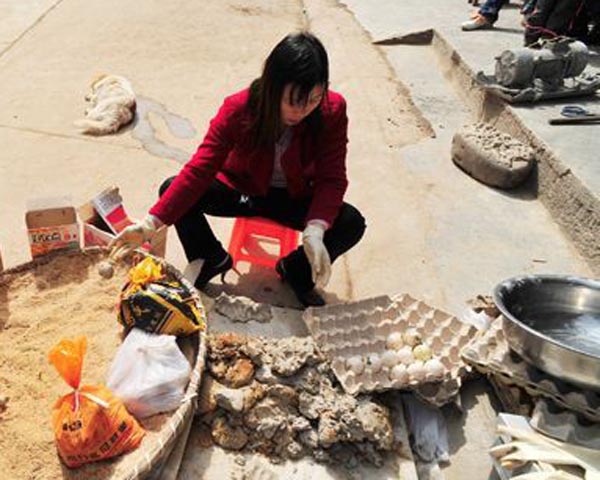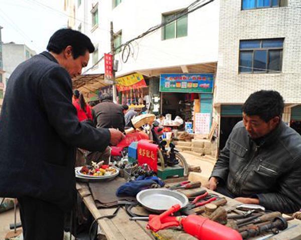 瞧,这是一个正在包皮蛋的小商人。每当赶集天,她都会在街上摆个摊,为客人现在制作皮蛋,生意很不错,一场能包上千个蛋。她给我介绍这手艺是他祖辈们传来的,还保密呢。由于长期在这里做生意,老百姓很信任她,都会时不时来照顾好的生意。
