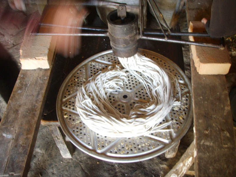 人们把这粉面拉回家,遇上大晴天,粉面被倒在油布上晒着,一两天就可以晒干,然后用专门的筛子筛的细细的再装进袋子里保存着。