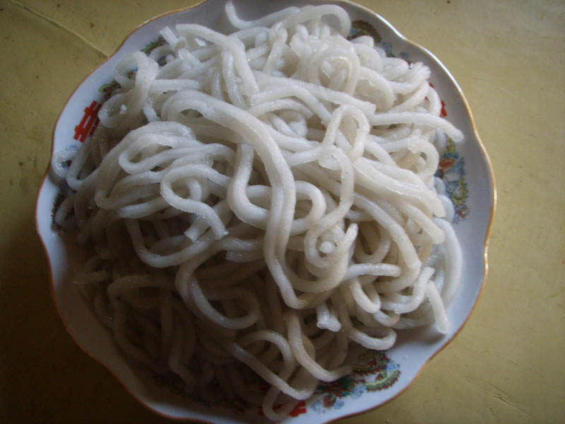 要想吃的时候,把粉面像做面一样先和好,然后用压面条的机子把它压成条状,下到沸腾的开水里,大约泡上十来分钟就可以捞出来,这样,粉条就熟透了,接下来给里面放进各种调料,然后一搅拌,就可以享受香喷喷的手擀粉条了!