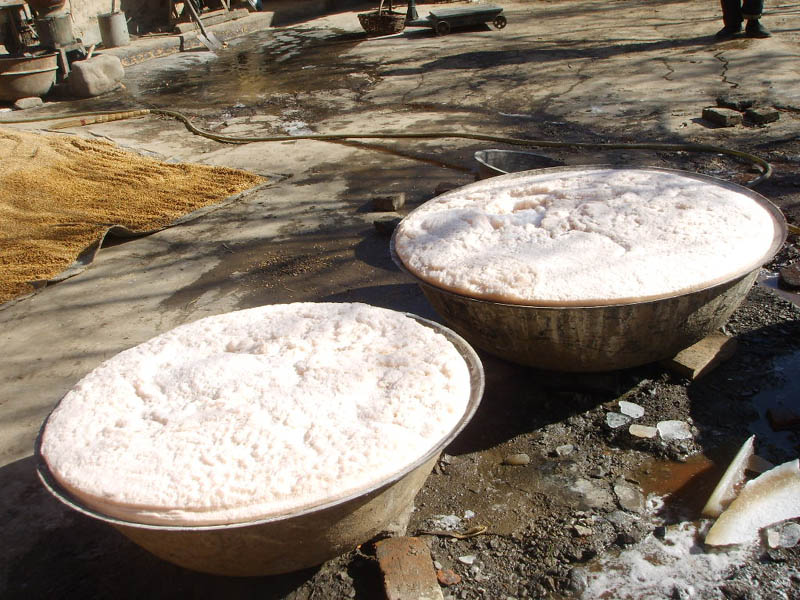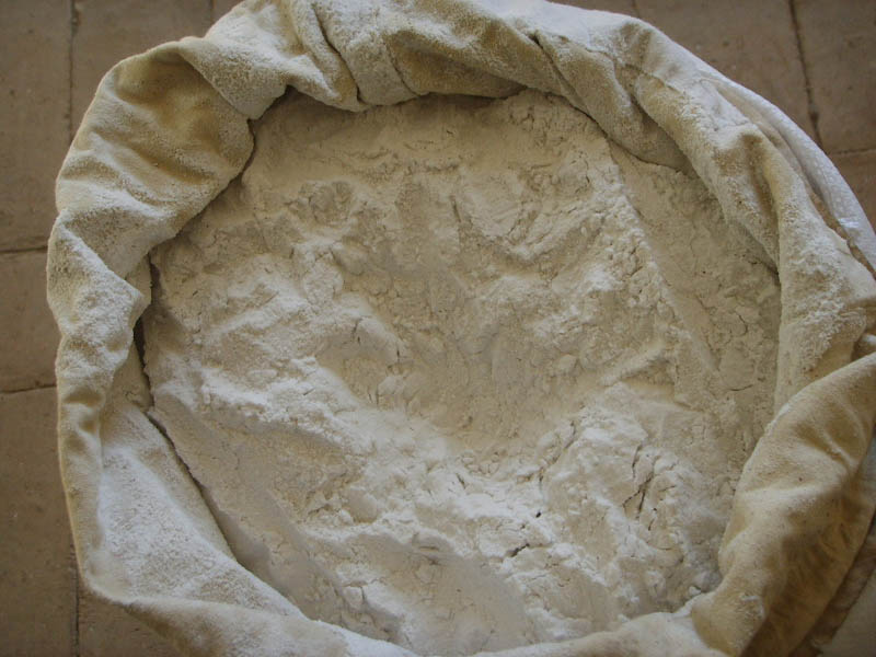 然后把这些物质倒进一个很大的锅里面,让这些"水"在里面沉淀,等水干了,里面剩下的就全是粉面了,但这看起来是挺白的粉面,可里面却还存在一些水,有经验的农民会在上面铺一层纱布,把一些从炉子里掏出来的干灰倒在上面,这样,粉面里的水就会全部被吸干。
