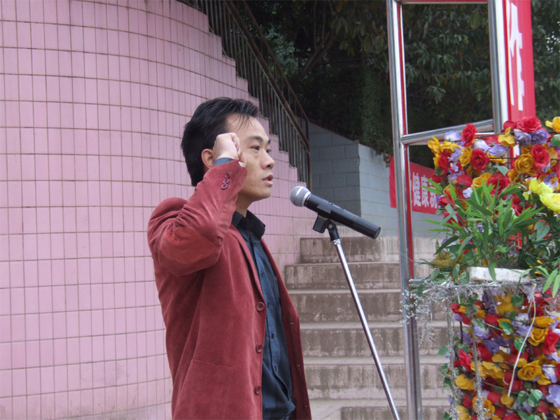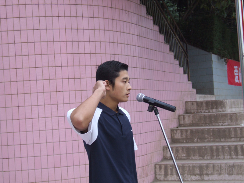 他是我们运动会的运动员代表,他在开幕式上宣誓,在比赛中不违规做弊,尊重裁判的判罚,尊重对手,赛出真实水平,发扬友谊第一,比赛第二的精神。