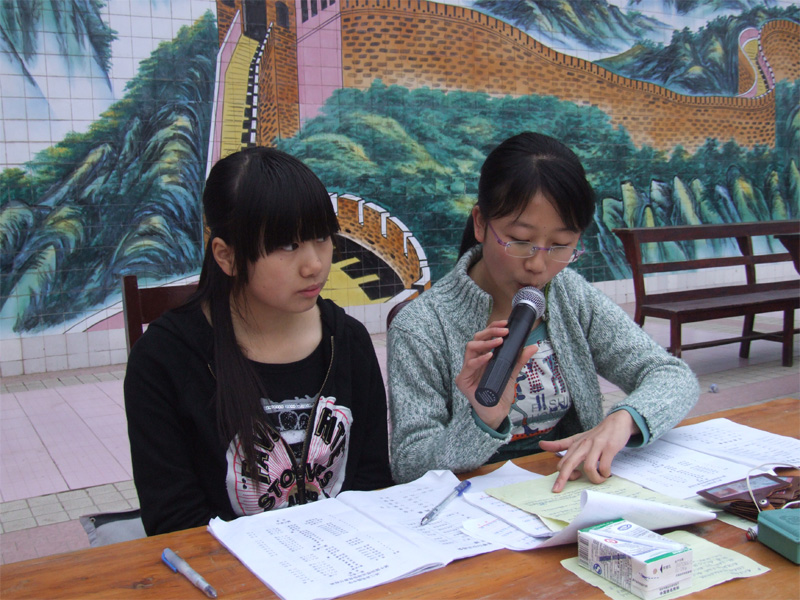 她们是运动会期间的广播员,运动的几天时间里,她们用自己的声音为各位运动员和裁判传递着信息,为运动员加油鼓劲。她们不能像其他人一样,冷的时候就到处走走,跳跳,她们的工作地点就是这张桌子,不能够离开半步,冷的时候她们只有跺跺脚,我为她们的精神感动。