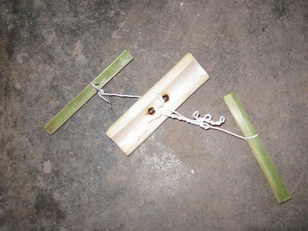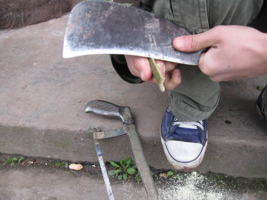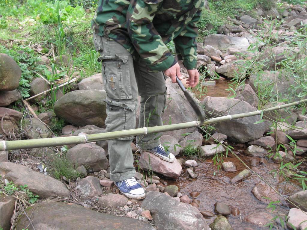 接下来的工作就是用锯子把竹子中最直的一节锯下来。然后用刀把竹筒劈成小片状,再用刀慢慢削平削光滑。另外还要再削两根光滑的小棍。