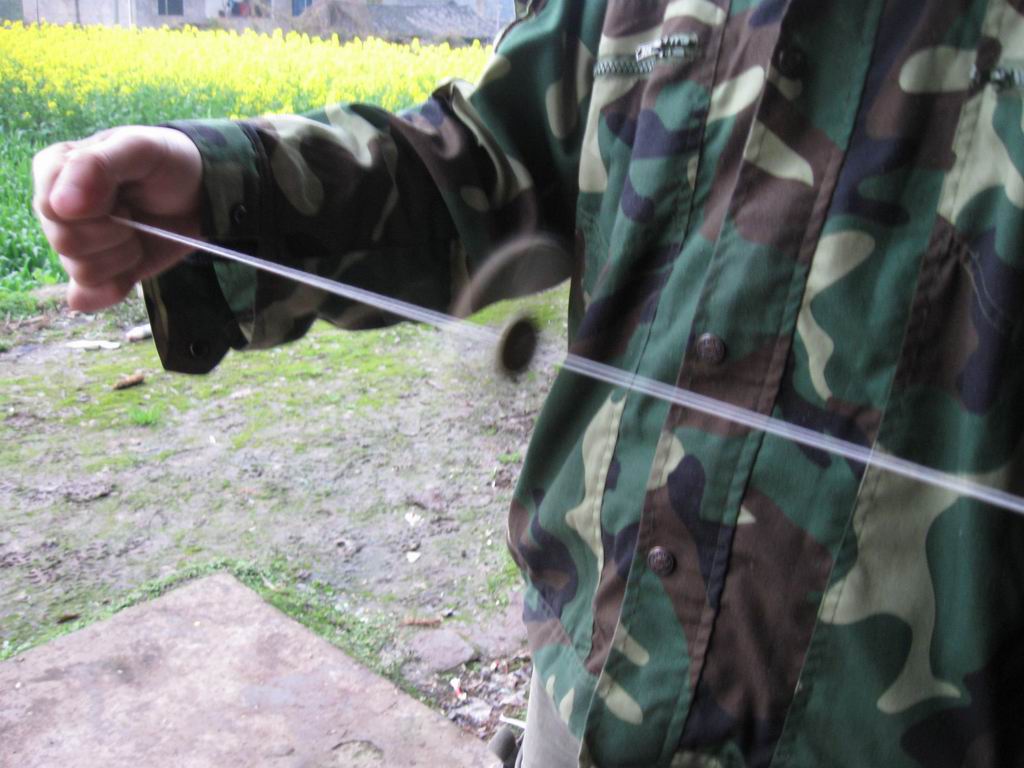 最后一个工作就是穿线了,我找来较结实的棉线,分别从两个眼中穿过去,两头套上小棍,木老虎就做成了。它的玩法就是拿着小棍向两边拉,木老虎就会忽忽地转,那声音就像是老虎的吼叫。听着这声音我就想起童年的那些快乐往事。