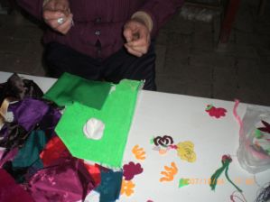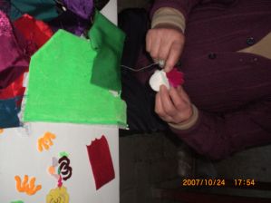 刚开始她将那些硬纸裁成大小相同的方块,把这些纸再折成一个个像西瓜牙似的几何体然后往里塞棉花,这些几何体便被装的鼓鼓的,此后用棉布一个个缝裹好,最后用糨糊粘在一起,一个个必须挤得紧紧的,等糨糊干了以后,就把底部的穗和上面的挂绳缝上去,这样一个漂亮的绣球就出世了。