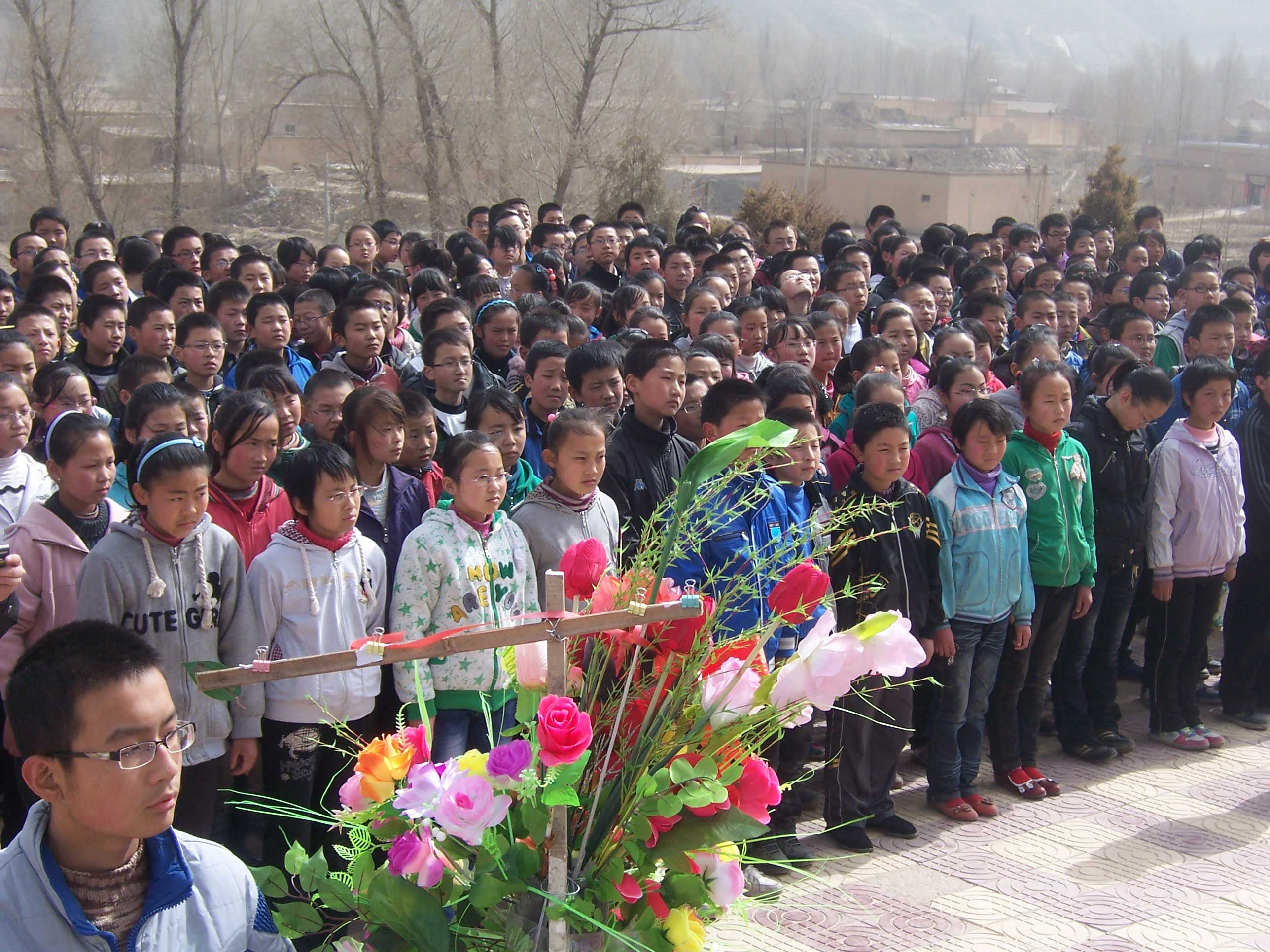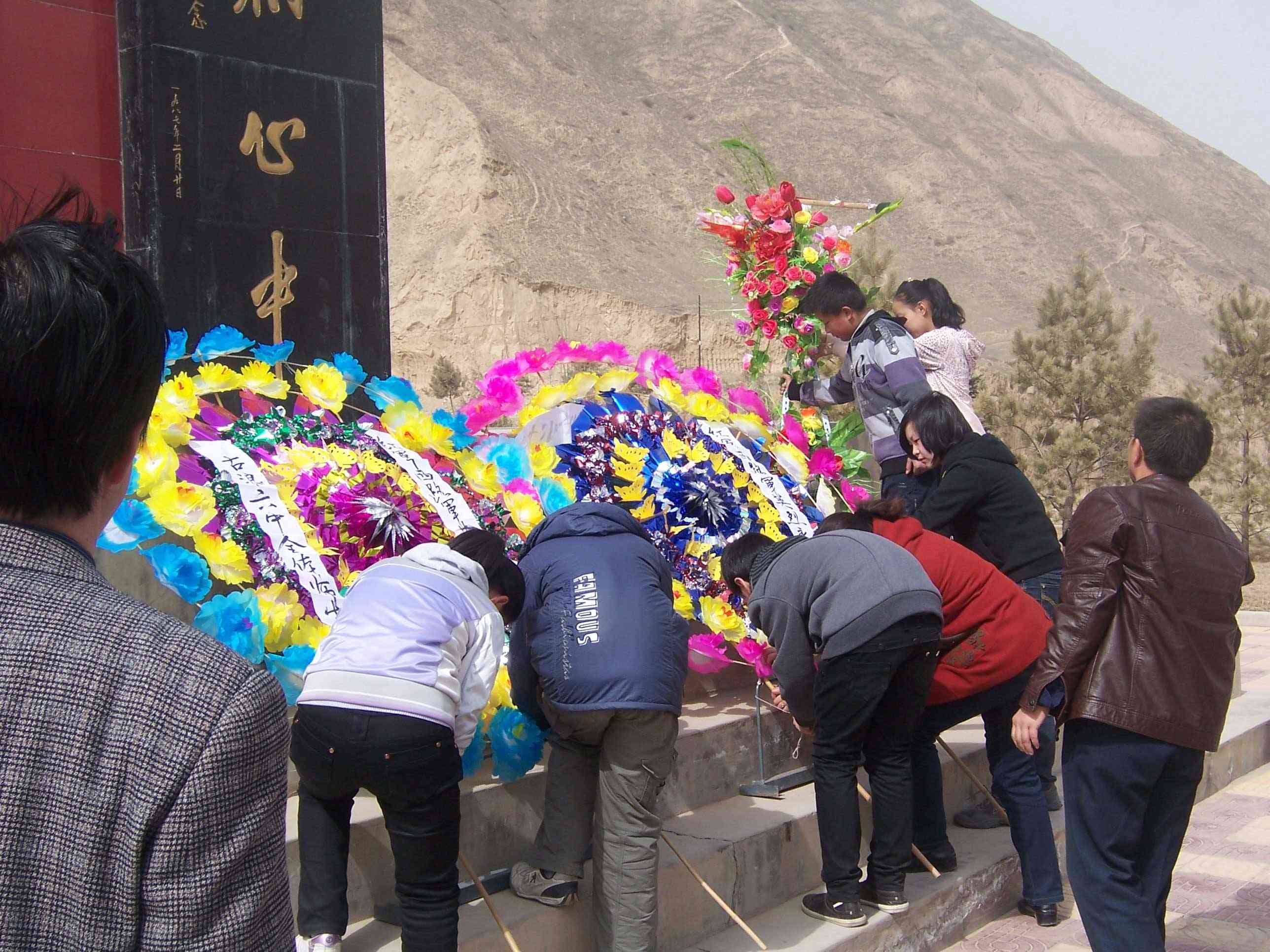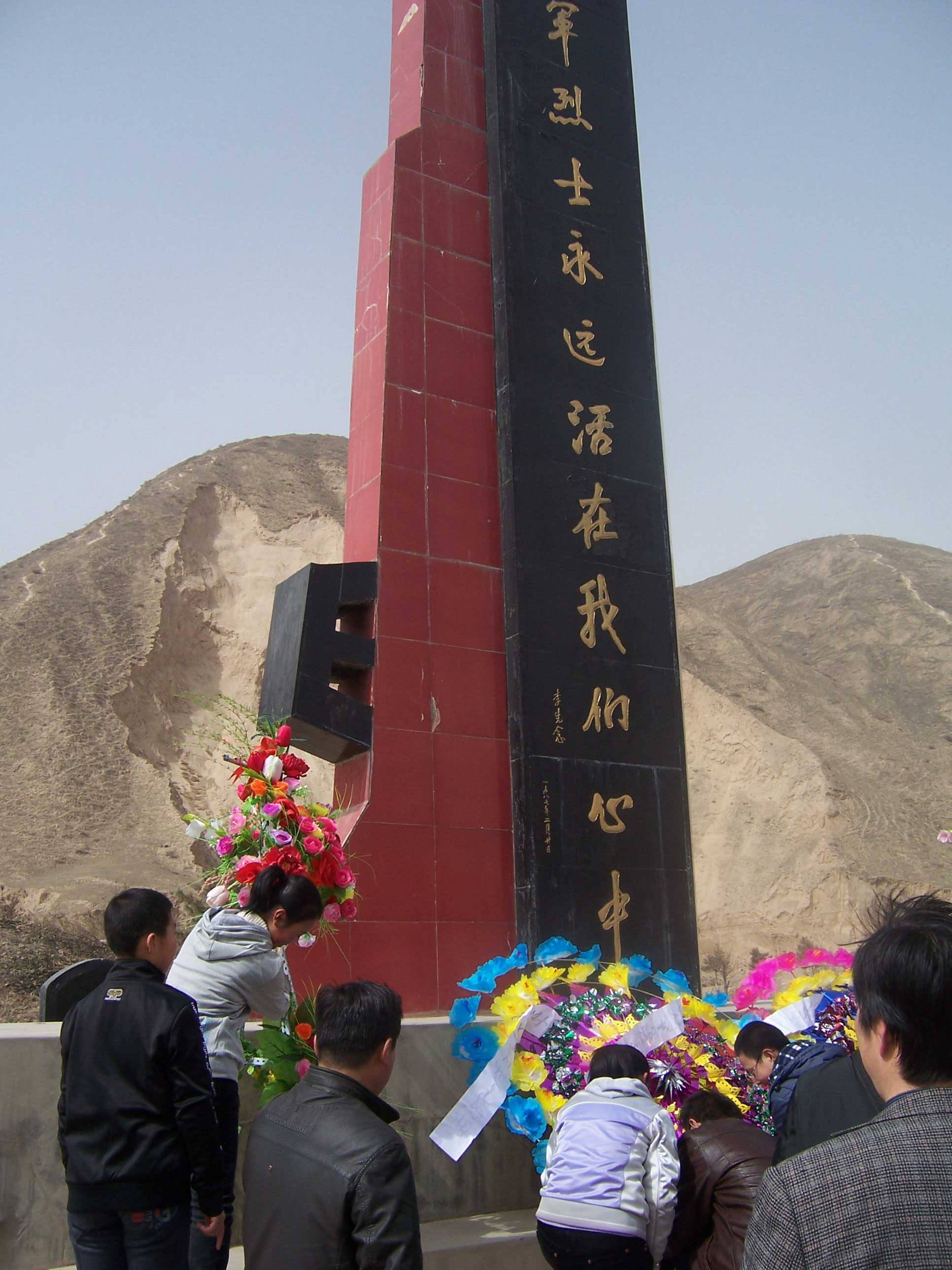 仪式开始了,喧哗的队伍很快肃静了下来.纪念碑上空回响起学校领导康主任慷慨激昂的声音:同学们,今天是清明节……这声音催人奋进,每个同学都思绪万千.仰视着高耸的纪念碑, 我的思绪也随着风儿回到了那个战火纷飞的年代:这支英雄之师与数倍于己的国民党马步芳、马步青军队顽强拼搏,浴血奋战,最后弹尽粮绝,几乎全军覆没。西路军全体指战员,以不怕一切艰难险阻的无产阶级英雄气概,在中国人民解放斗争史上,写下了无比悲壮的一页。仪式第二项: 为英雄进献花篮. 六位共青团员统一着装,将一个大花篮小心翼翼地摆放在纪念碑前.