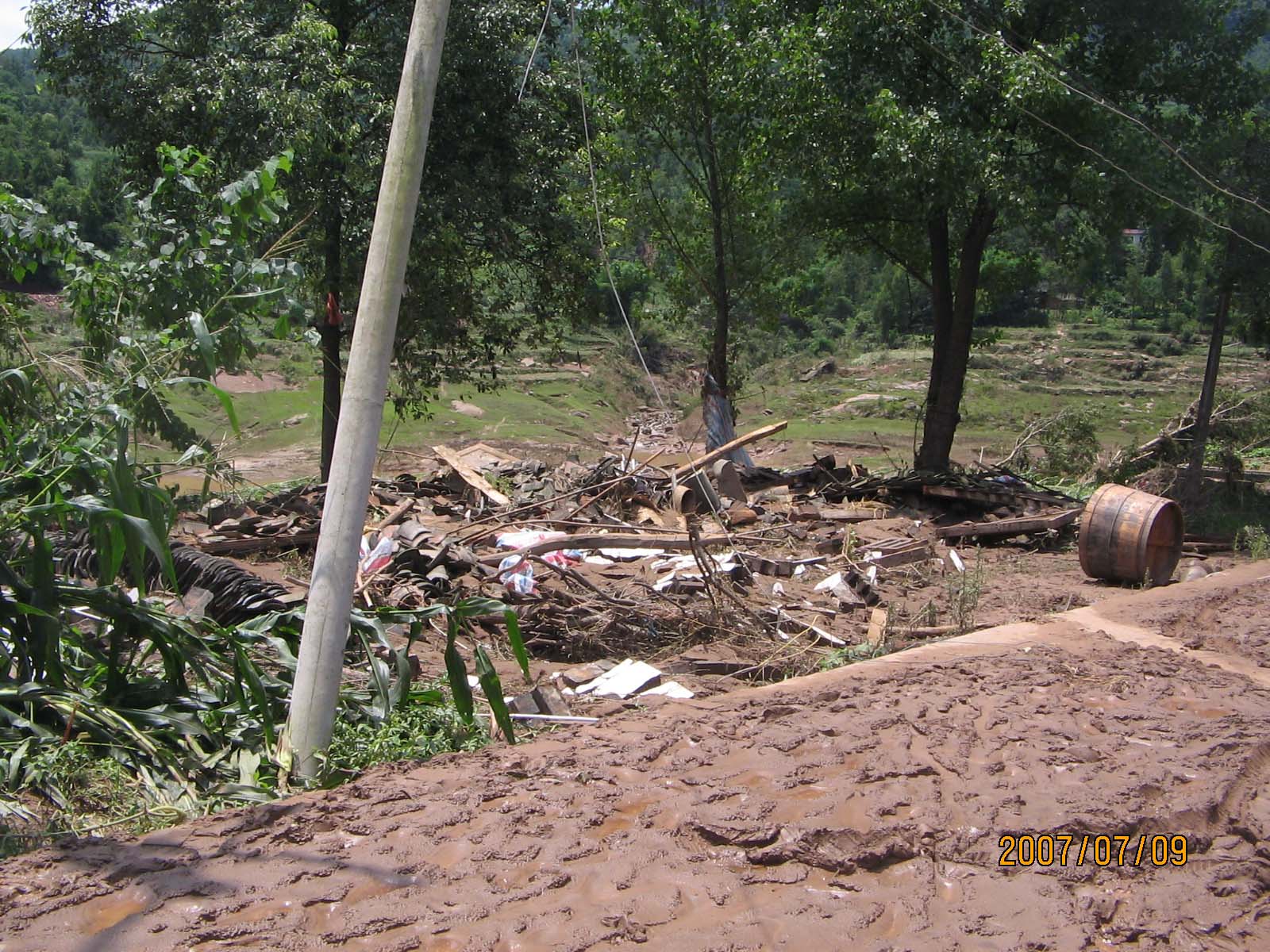 一根在河边上的电杆已经被洪水冲得东倒西歪,洪水过后,电力设施毁坏严重,在炎热的夏天,村民们没有电,没有干净的水,生活非常辛苦,地里的庄稼今年也没有了收成。