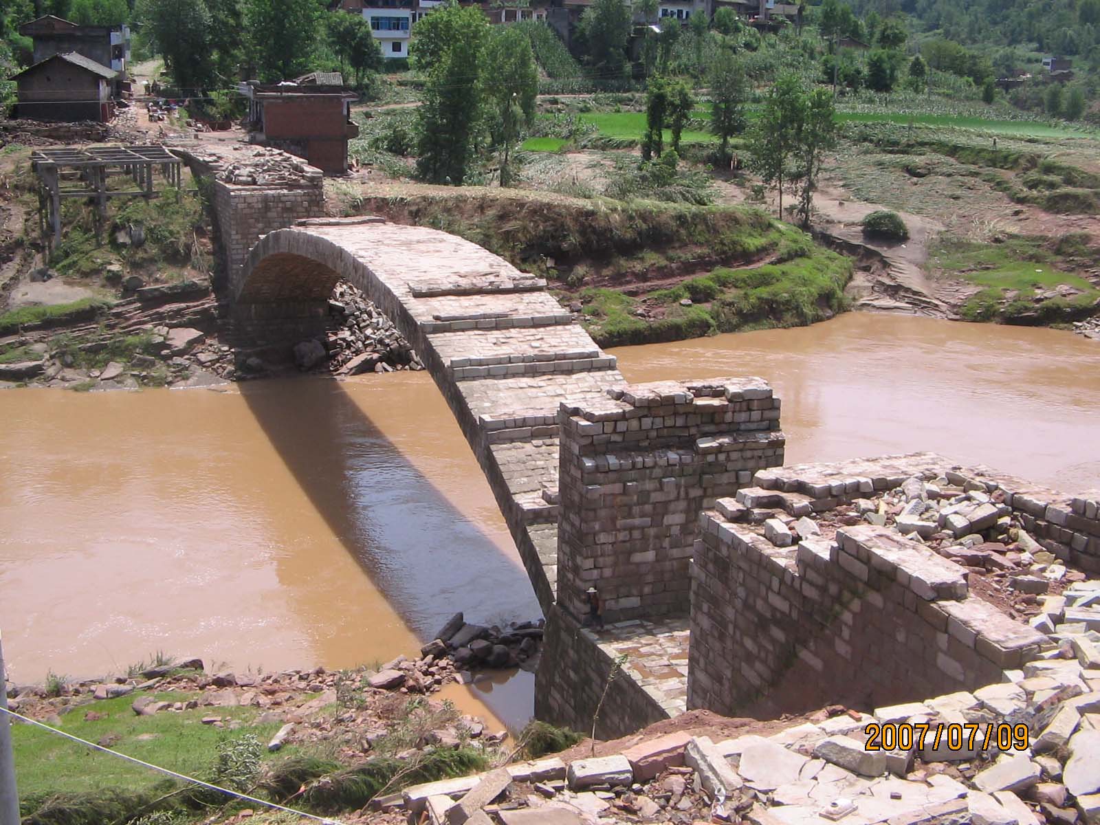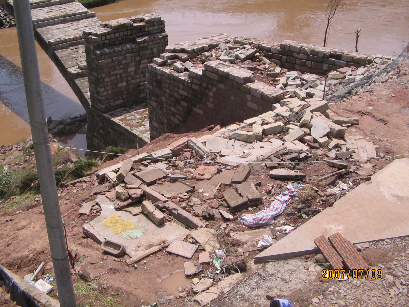 这是一座石拱桥,已经有几十年的历史,经历了无数的大风大浪,他都安然无恙,但这次的洪水却让它承受不了,桥只剩下一副架子。不过还是感叹它没有完全的被冲毁。