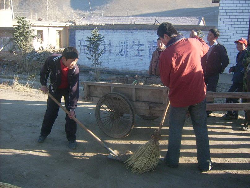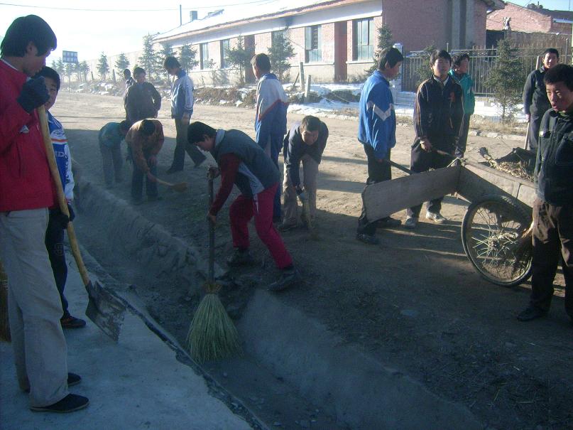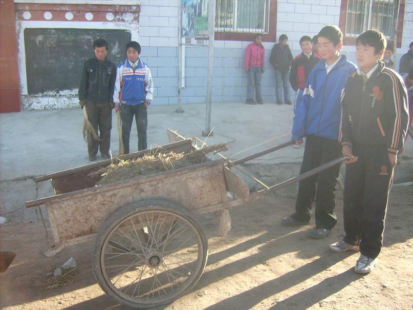 然而铁锹的数量很少,垃圾逐渐堆起了一大堆,同学们都望着这堆垃圾发了愁,该怎样才能清运这堆垃圾呢?就在这困惑的时刻,吴鸿江同学突然站出来说:"用我家的马车拉吧"。大家纷纷赞成,于是他就和一个同学到他家拉来架子车,同学们都向他投去了感谢的目光。