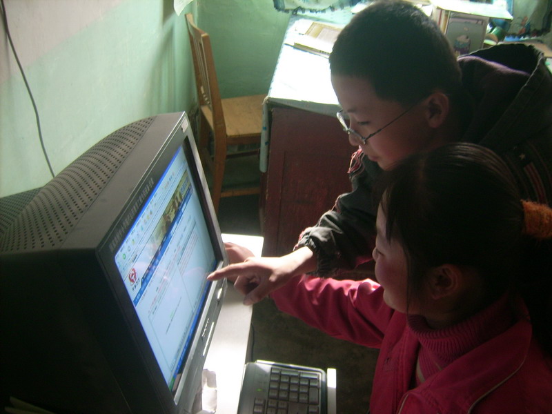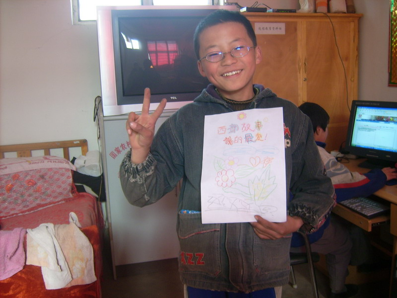 别看这位男孩比较羞涩,他可是一位实力派人物。就拿这次制做西部故事网页来说,在别人都没有察觉之中,他已经凭借自己的努力全部都完成了,而且成绩很优秀,在八篇作品中有四篇就是推荐。于是他又受老师的重任帮大家指导,如果大家遇到问题时都会请他帮忙,只要一举手他就来了,所以他有就有了一个外号"招手来",你瞧!现在忙碌的他又要去指导一位同学了。