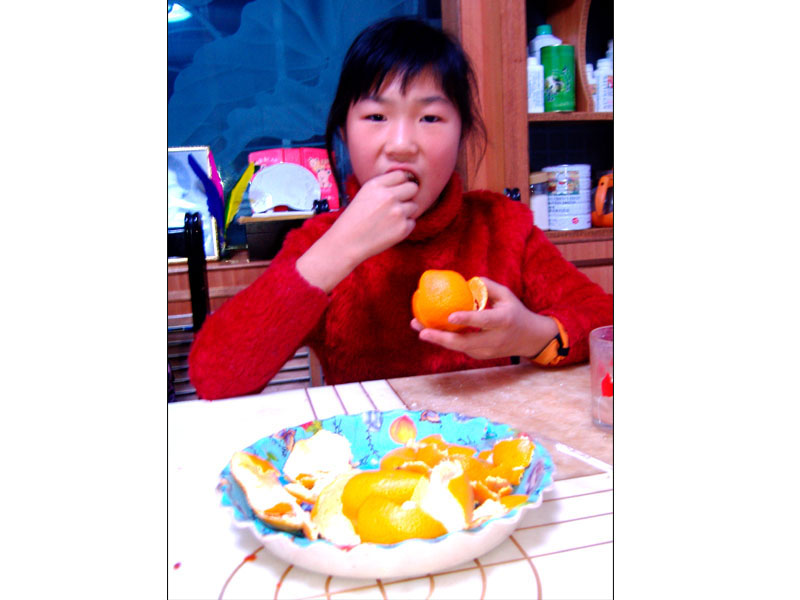 我想,妹妹平常吃东西,最爱独吞,她肯定是把橘子全吃完了。于是我加快脚步,跑出去找到了妹妹,我气乎乎,凶巴巴地对妹妹说:"是不是你把橘子吃了。" "我,我没……"我没有听她讲那么多,便伸腿踢了她几脚,转头走进屋了。过了一会儿,妹妹从柜子里拿出十三四个橘子慢慢走来,把橘子全塞给了我。