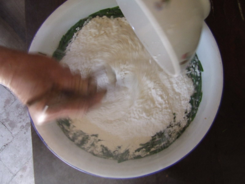 接下来,该是放面的时候了,同样一边倒面,一边用筷子用力搅拌。搅拌好的标准是:1.要求几乎没有小面疙瘩;2.面水不能太稠,也不能太稀,当用勺子舀起来向下倒的时候,能连成一条线,那么面水才算得上搅拌好了。 这一步是关键的一步,要很用心哦!