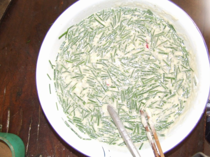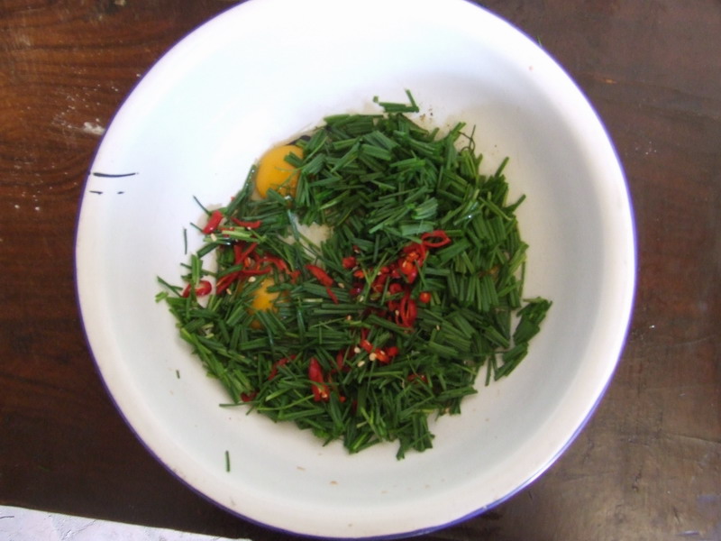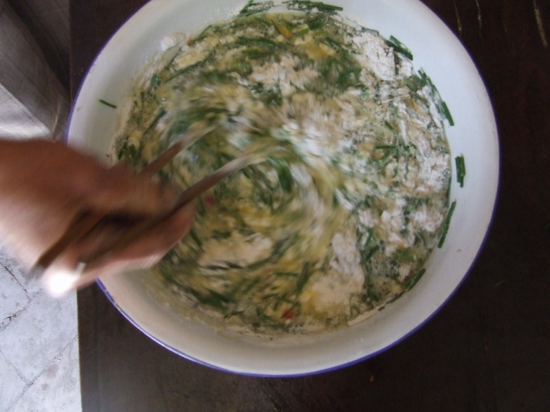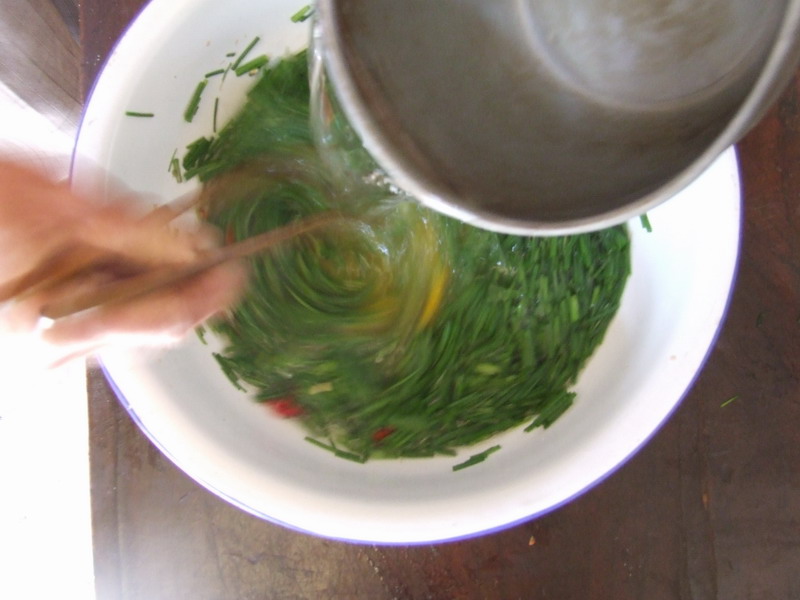 把准备好的葱花,菲菜、红辣椒和鸡蛋盛入盆内,然后一边倒水,一边用筷子不停地用力搅拌。