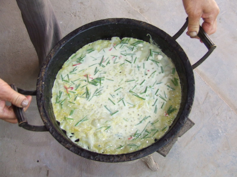 先把平底鏖放在火炉上,倒一些油均匀抹在底上,等油热了,就把面水倒入平底鏖里面。