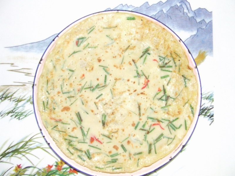 准备的原料:两勺水,多半碗面,六个鸡蛋,还有就是切好的葱花、菲菜和红辣椒。 外加一些平常用的调料,食盐适量。