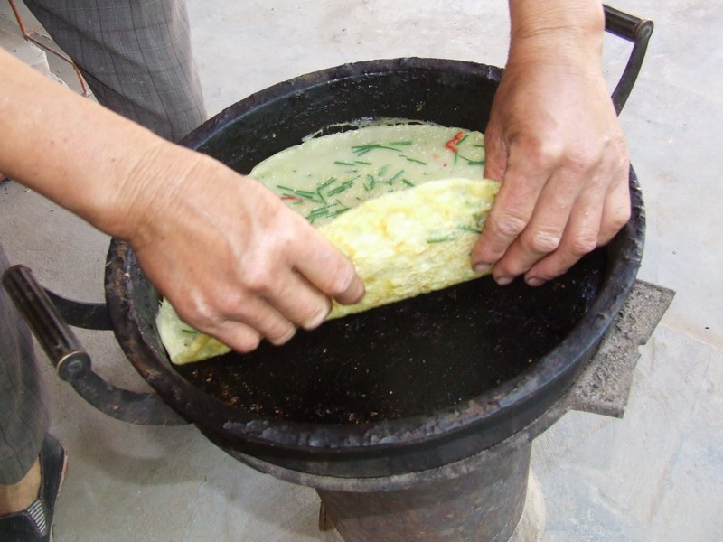 用两手将鏖平底拿起来上下摇一摇,面水基本上就铺匀了,不匀的地方可以用锅铲抹一抹,大约2~3分钟的时间。我们就可以把煎饼翻过来了,技术一定要高啊,否则会把煎饼弄烂的。