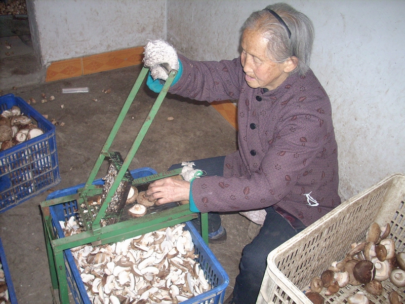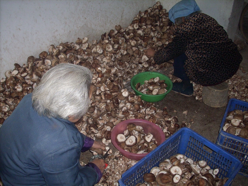 10月初,香菇有到采摘的时候了,外地收购香菇和加工香菇的人们也陆续忙活起来,学校门口就有一家外地人开的香菇烘烤店。关闭了好几个月后,又开始经营了。农民们将采摘下来的香菇用自行车带来卖到这里,然后由这里烘烤,这里一般都雇佣几个老人干活,先挑拣大小不一的香菇,然后再切碎。