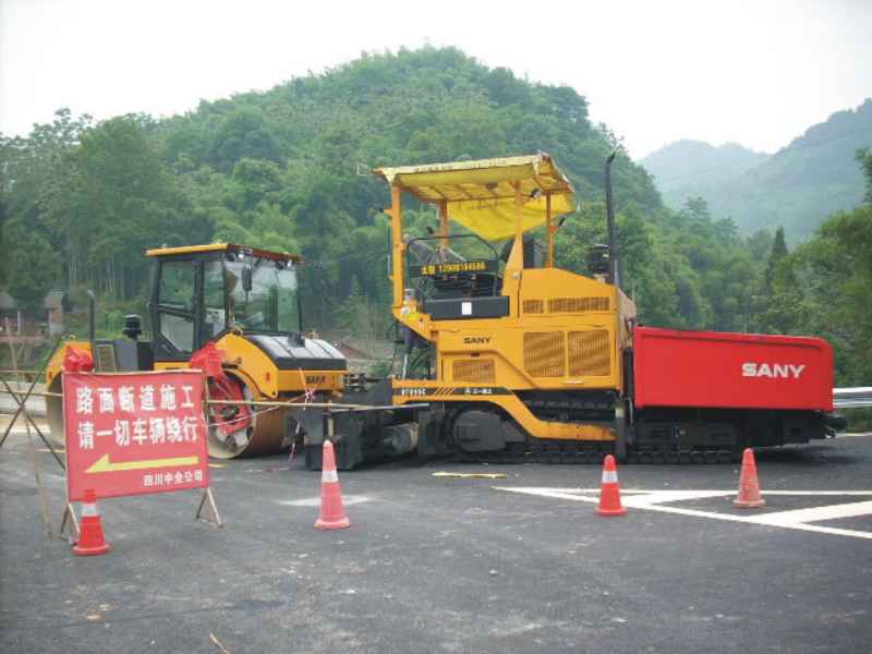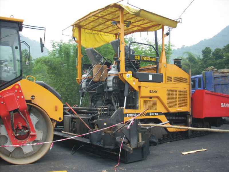 桥头还停靠着一辆压路机和一辆奇怪的车,从其外形和那残留的沥青路面的材料看来,它应该是一辆铺沥青路的车。