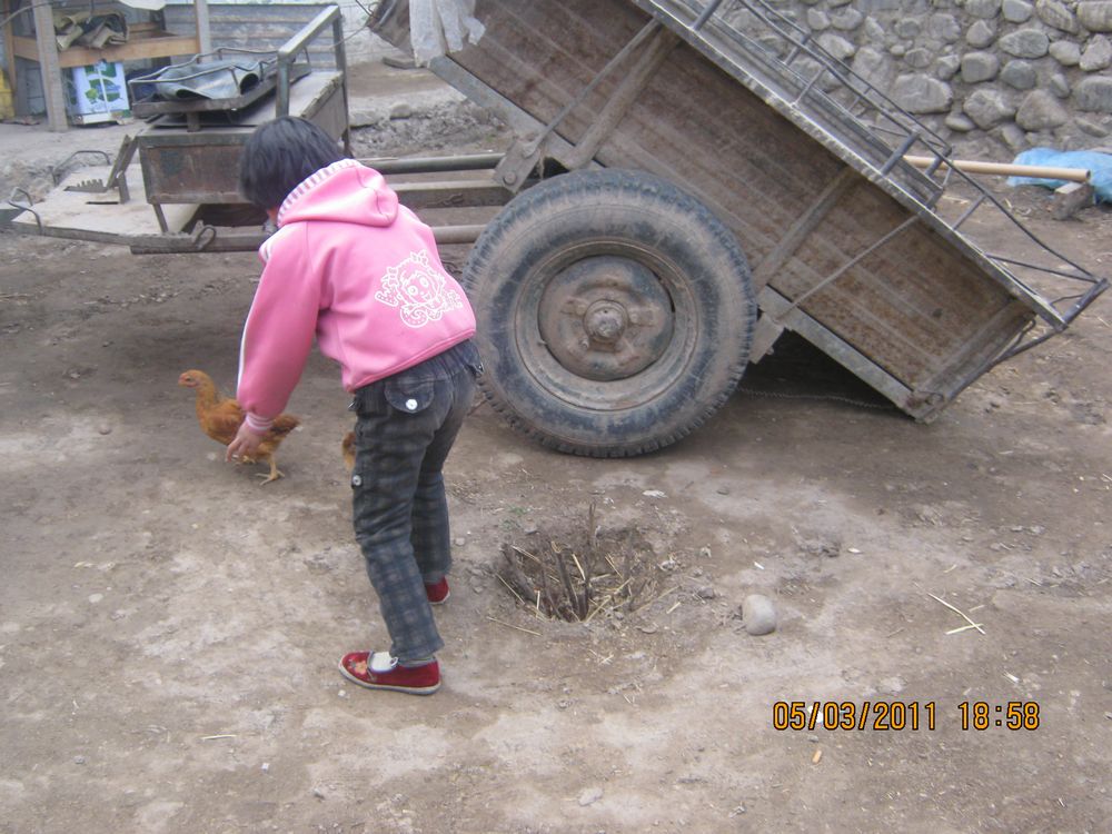 我看得入迷了,想起前不久学过的一篇诗文,不知不觉地吟诵起来:"小黑鸡,小黄鸡,欢欢喜喜在一起,刨刨土,捉捉虫,青草地里做游戏。"我不禁突发奇想,决定给小鸡打扮打扮:小黄鸡,现成有,小黑鸡没有,对了,给它染成黑色,我拿出了水彩笔,抓住了一只小鸡就准备染起来,可是它不听话,叽叽喳喳乱叫,还不停地乱动,我都有点手忙脚乱,我染了一下,可是毛很蓬松,根本不听话,染不了,我急得满头大汗,嘴里不停地叫着:"别动,听话,我给你吃糖。"奶奶听见了鸡叫声,闻声赶来,看见我正在欺负小鸡,便大声喝止:"放下,你怎么能欺负它呢?"我只好放下小鸡,可是鸡被我染得乱七八糟,也许是受到了惊吓,小鸡立刻跳到了旁边立放的一堆木头孔隙里。我急得大叫:"快出来!快出来!我还没画好呢,你还不漂亮。"奶奶在一旁看得哈哈大笑。