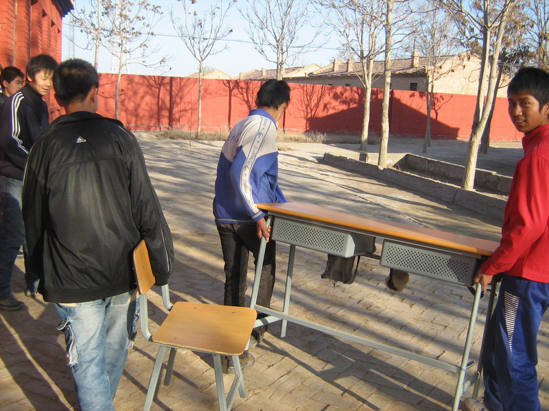 学校的简陋条件被社会上的爱心人士所关心和支持,在本学期听班主任说有位爱心人士给我们捐来了新课桌一百多套。准备配给我们。这个消息让我们心喜若狂,迫不及待的扑向新课桌。双手抬着这光滑的,崭新的课桌心理美滋滋的。