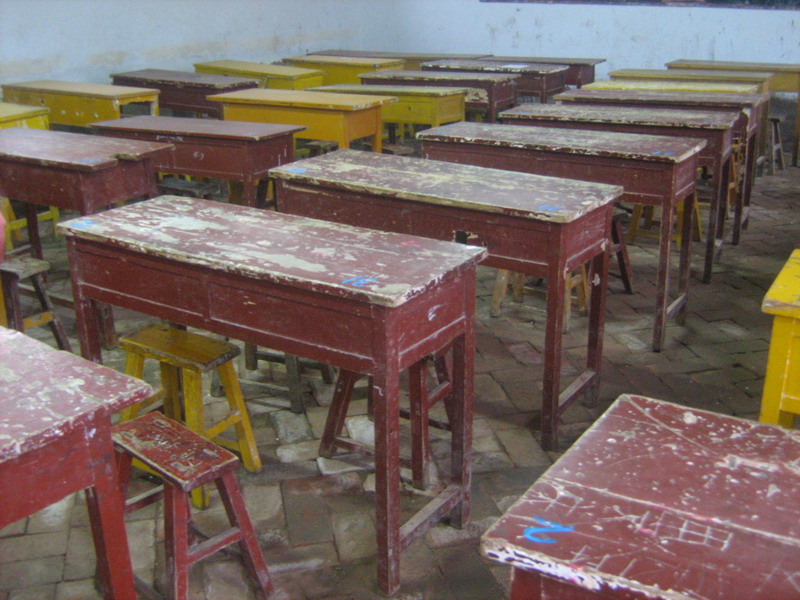 教室里的课桌可算是古董了,红漆刷过的木制,课桌年复一年,日复一日,的用过。很早以前就咯吱咯吱的松框不得。表面的吭吭哇哇,给同学门的答题带来许多麻烦。一不小心就桶个洞,每年,学校里都会一批接着一批的更换或修整。