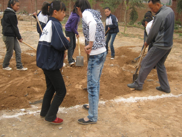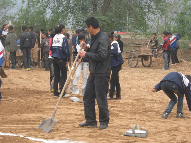七年级和八年级的同学都参加了这次劳动,我们七年级的任务就是把操场东面的土拉过来,先把跑道上的石块捡掉,男同学用架子车把土拉过来,女同学负责把土摊平,再用脚在上面踩平。
