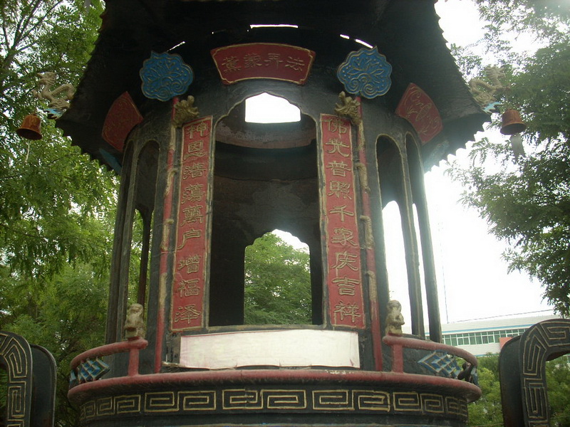 玉皇阁正门在南面,沿着正门向里面走,首先映入我的眼帘是一个用青铜铸成的香炉,香炉上面供着各种供品,香炉周身镌刻着精美的大字和图案。在香炉前面还摆着一个功德箱。箱子呈正方体,每到香客进香时,可以进行跪拜,很多跪拜的人都把自己钱放到功德箱内,表达自己的一个美好的愿望。在香炉西边我们可以看到一个高大的观音金像,观音金像慈目清秀,左手拿净水瓶,右手持一根清柳枝,通身金亮,在阳光照耀下,显得更加神色。