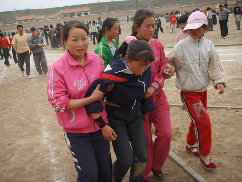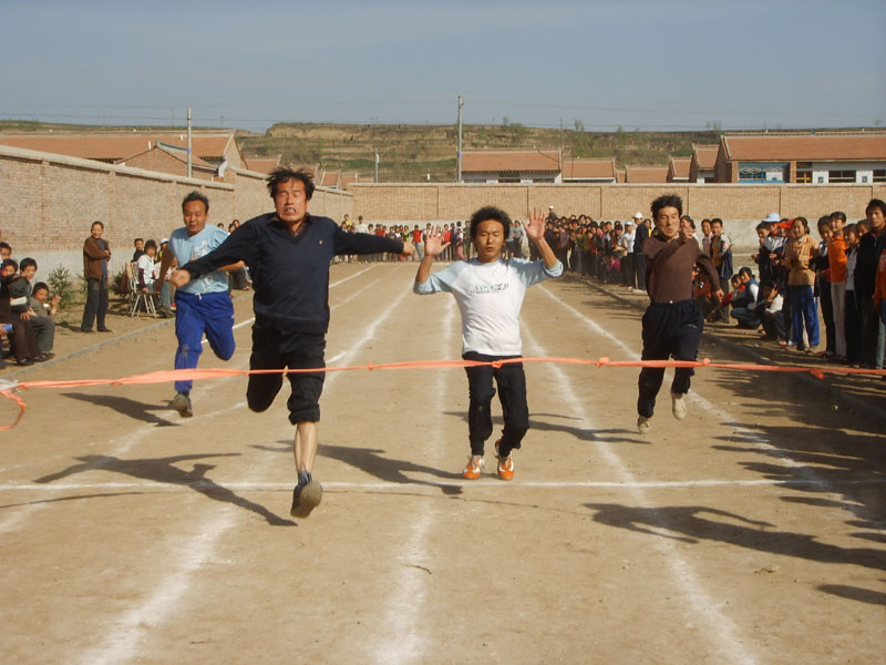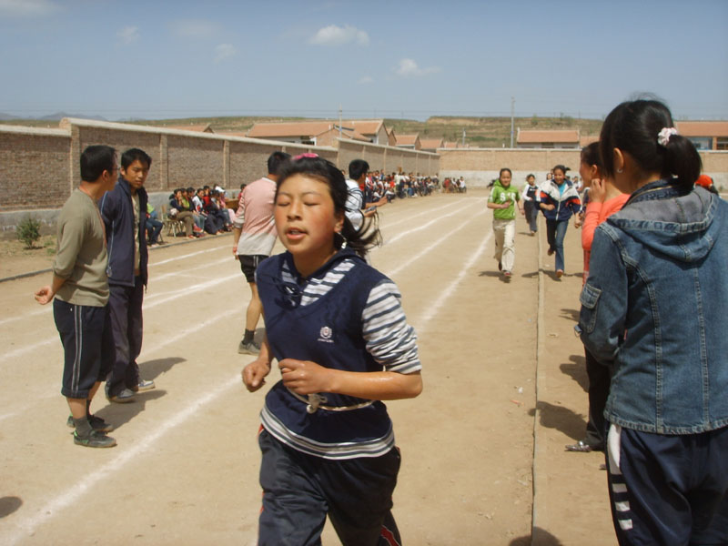呵!终点终于到了。他(她)们显然是累坏了。但未参赛的同学也没有闲着,他们后勤工作也做的很好——提早就等在了终点。当运动员们到达终点时,他(她)们便迅速冲过去,扶住运动员走几圈,然后递过毛巾、送来温开水、,看到同学们热情的"服务",运动员虽累,但心里却如喝了蜜一样,甜滋滋的。