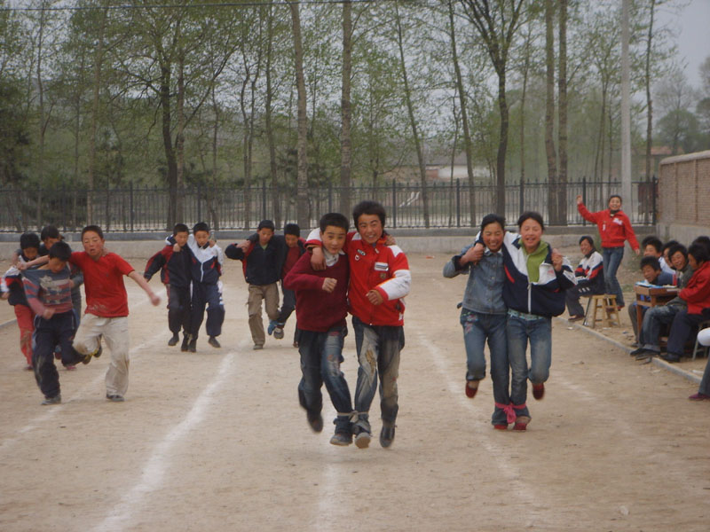 在比赛的项目中,最有趣的要属绑腿跑了。同学们两个两个把腿绑在一起,他们默契的合作使得所有的拉拉队都欢呼起来,"加油,加油!……"