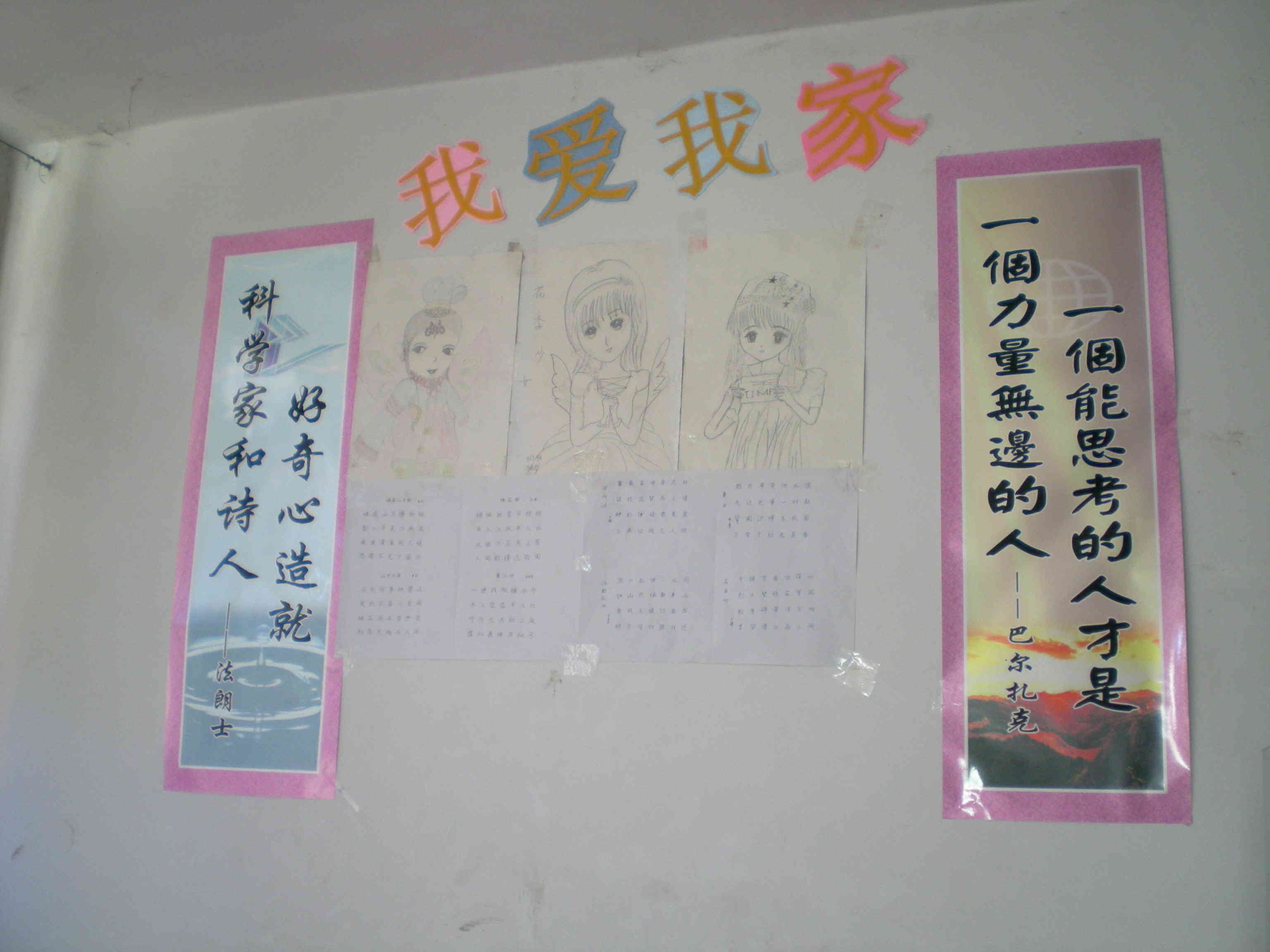 在我们宿舍的墙壁上,贴着"我爱我家"这四个字,下面还贴着好多画儿,两边是名人名言,非常好看。