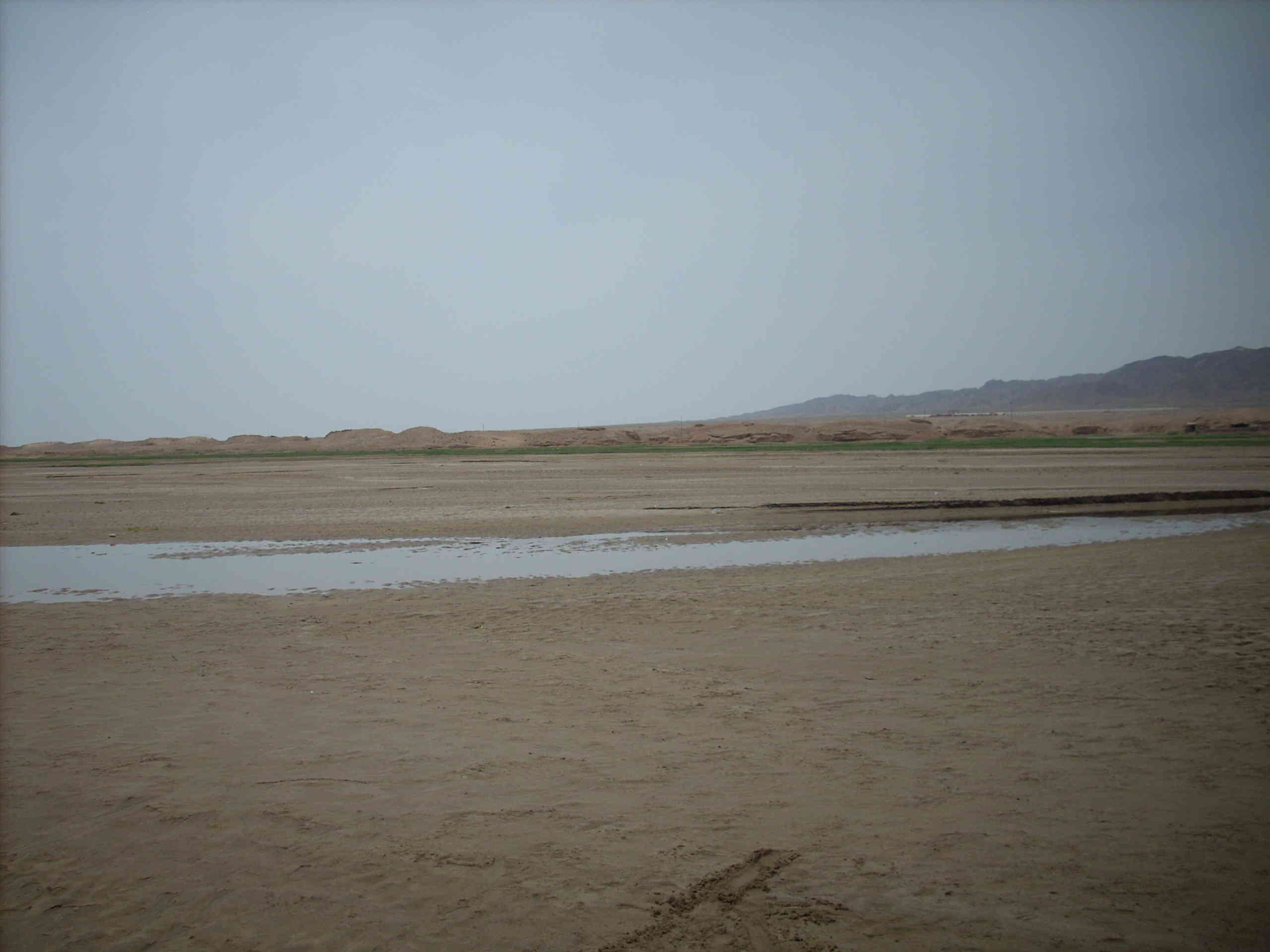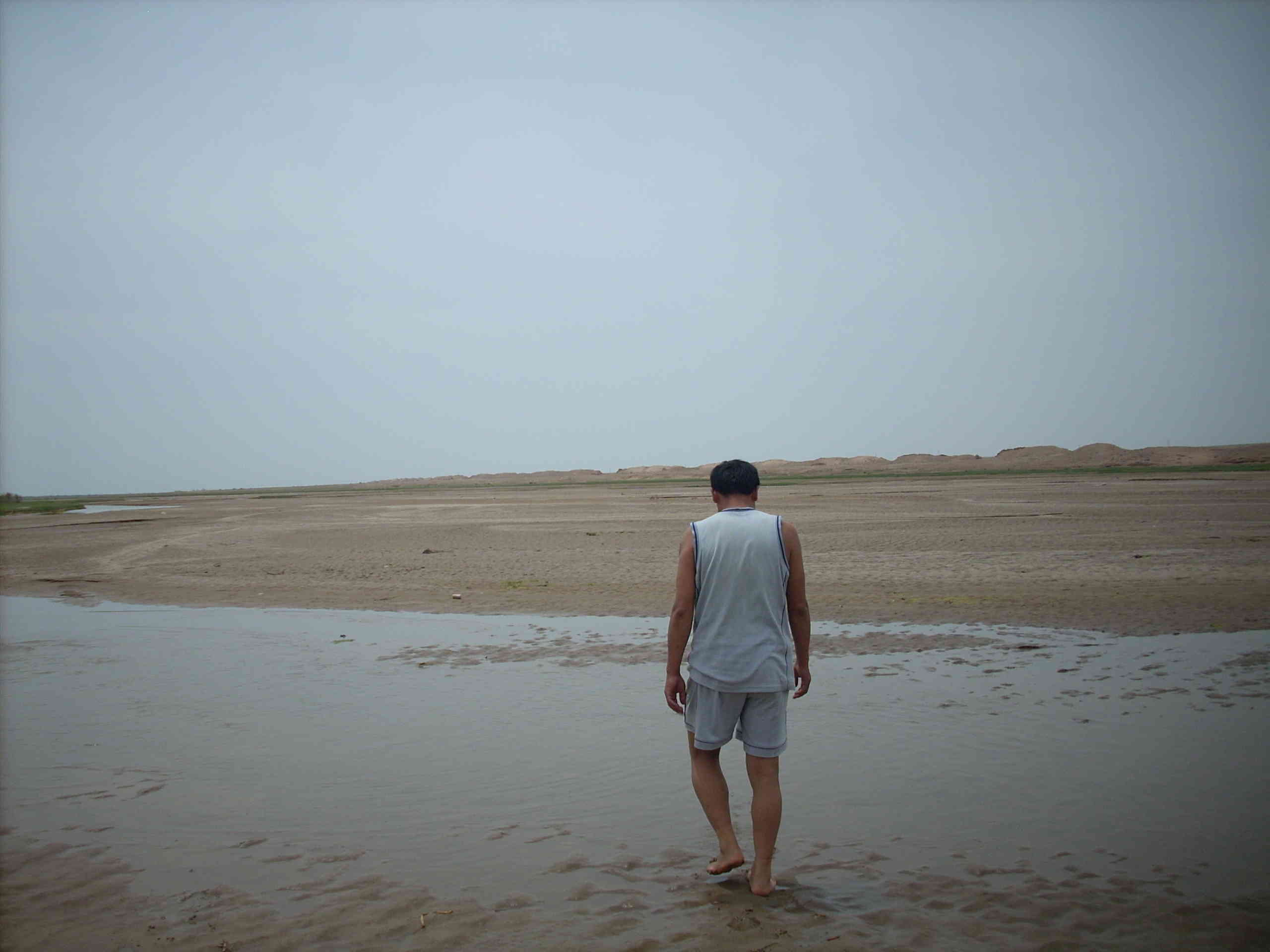 这是有水的河床最宽处,人走上去只有薄薄的一层水。他在寻找着过去的那个石羊河——我们的母亲河。昔日的景色不复存在,民勤人民将何去何从呢?