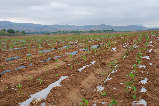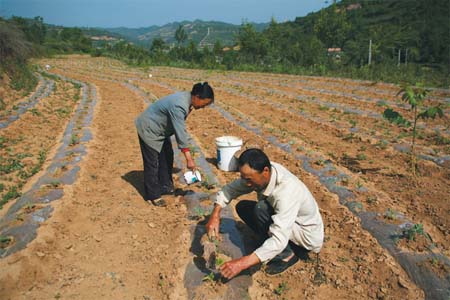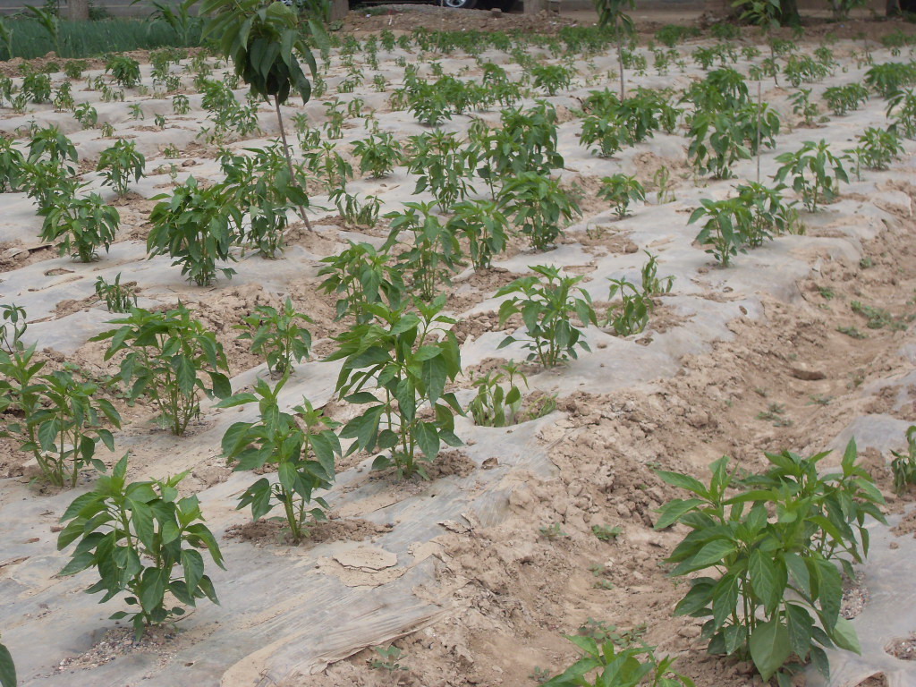 奶奶和姐姐先把一盆盆辣椒苗放在事先在压好的塑料地膜上,然后便拿起铲子在地膜上开始栽辣椒苗,我跟在她们身后浇水,爸爸妈妈跟在后面埋土。