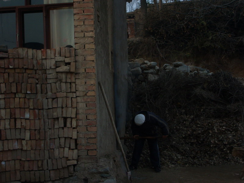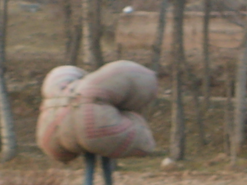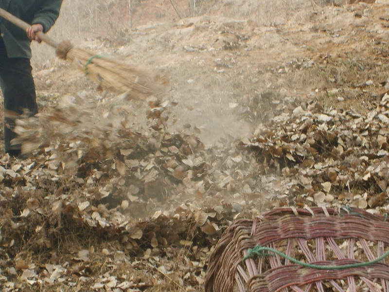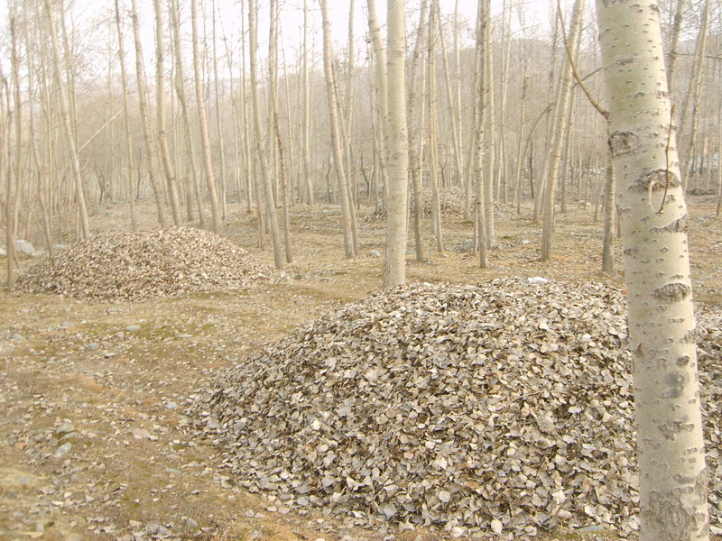 People always collect a great many of fallen leaves with a broom together and then put them into the kind of things in front of the woman and carry when they are free.But when they have no time to carry them home,they will collect them together like a small hill one after another as the picture shows and carry them whenever they have time.