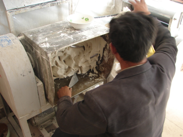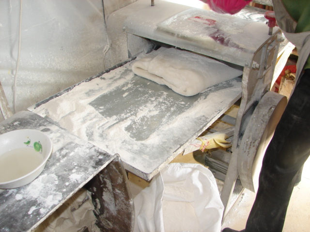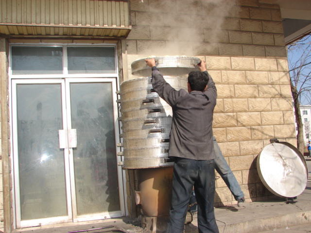 其实馒头店的行头不算多,一台和面机,一台揉面机,一张大案板,一架鼓风炉锅,十来个蒸笼.店里一共3个人,男老板、女主人、雇佣伙计一名,他们手脚都特别麻利,一刻也不闲地忙碌着。男老板主机负责和面,揉面,招呼顾客,女主人和小伙计围着特大号案板做出各式各样的馒头来。