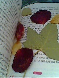 在我的书中有各种各样的树叶和各种颜色的花瓣。每次看这些东西,都会引起我很多回忆。因为,这些树叶和花瓣都是我在住院时收藏的。