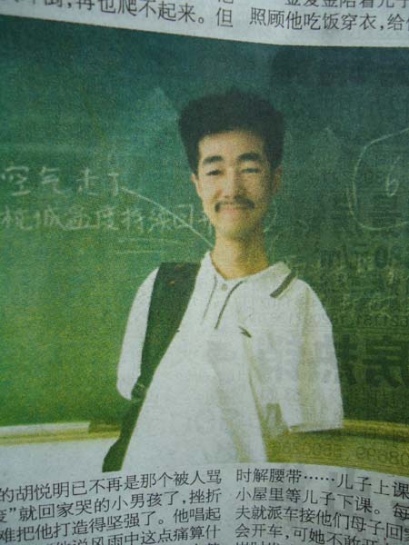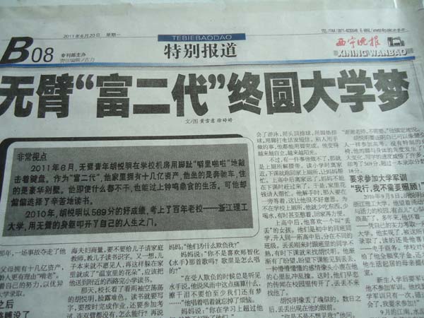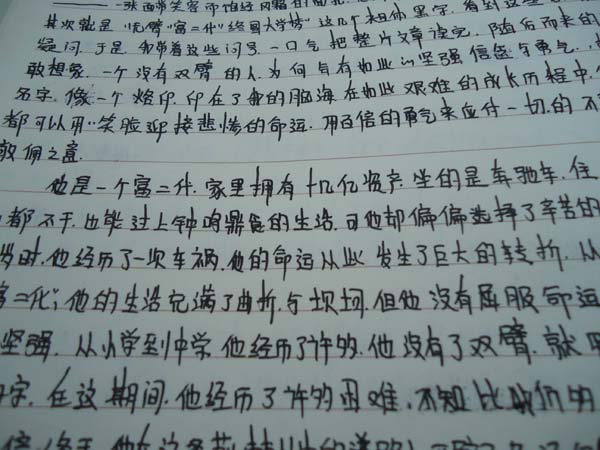 咱们班的后墙上贴了一张报纸,起初我也没太在意,后来看到同学们都在围观,我也过去看了一下,首先映入眼帘的是一张照片——一张面带笑容而饱经风霜的面孔,他没有双臂,站在黑板前,显得那么骨瘦如柴。其次就是"无臂富二代终圆大学梦"这几个粗体黑字,看到这些后,使我产生了一系列的疑问。于是,我带着这些问号,一口气把整篇文章读完,随后而来的是一阵心酸,我不敢想象,一个没有双臂的人,为何会有如此的坚强信念与勇气,胡悦明——这个名字,像一个烙印,印在了我的脑海,在如此艰难的成长历程中,他都能坦然面对,都可以用笑脸迎接悲惨的命运,用百倍的勇气来应付一切的不幸,他不仅是我心生敬佩之意。
