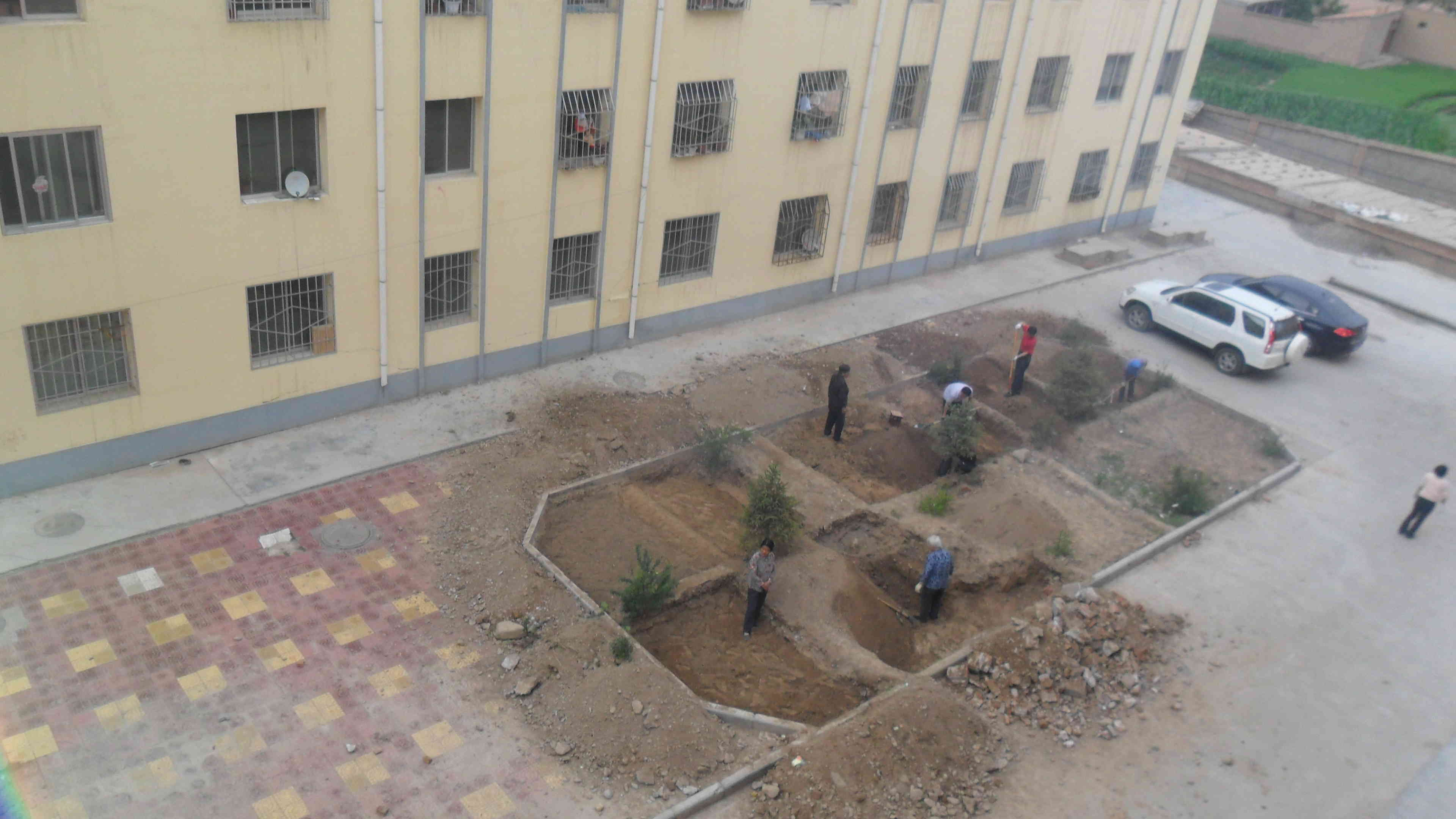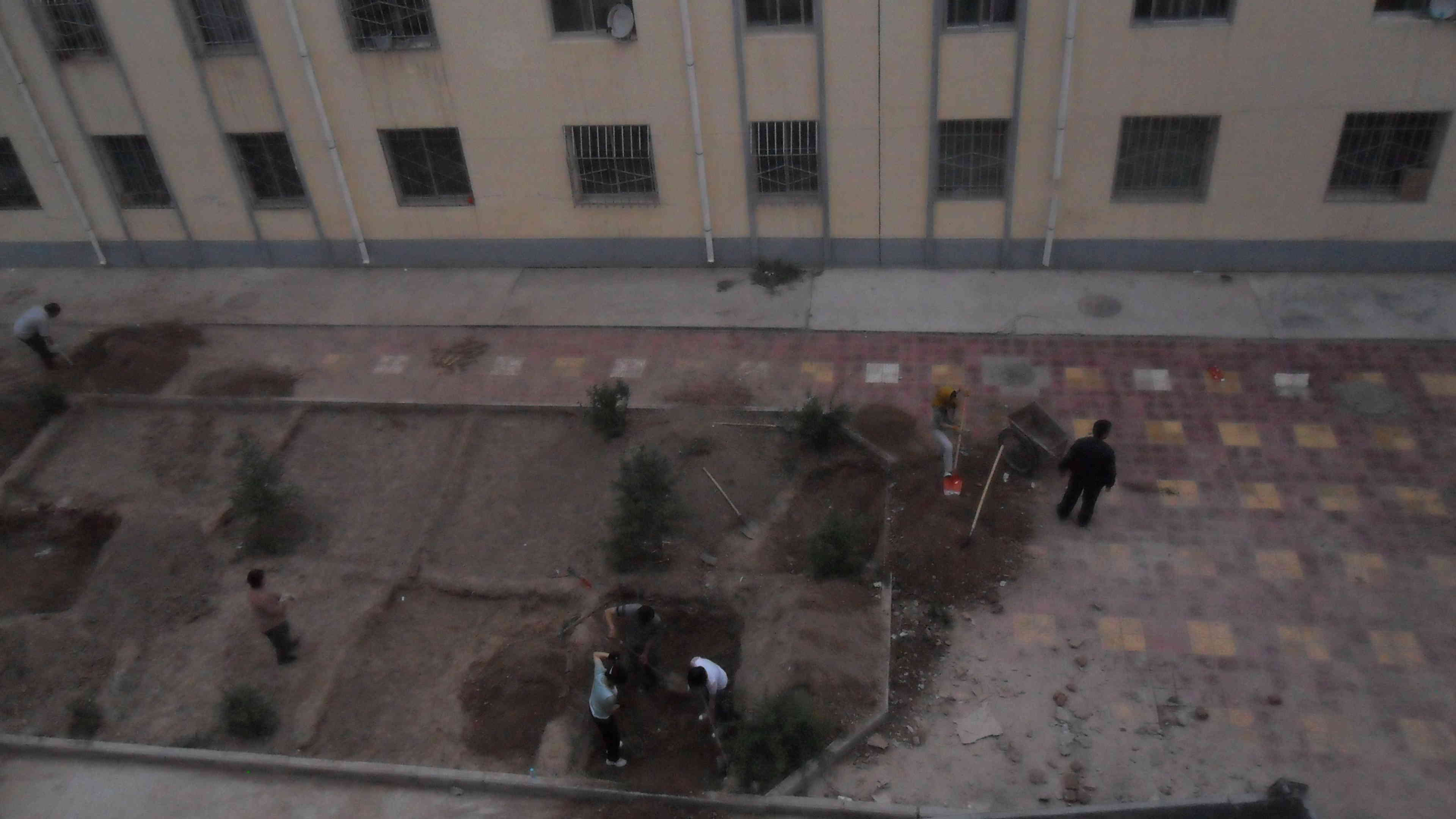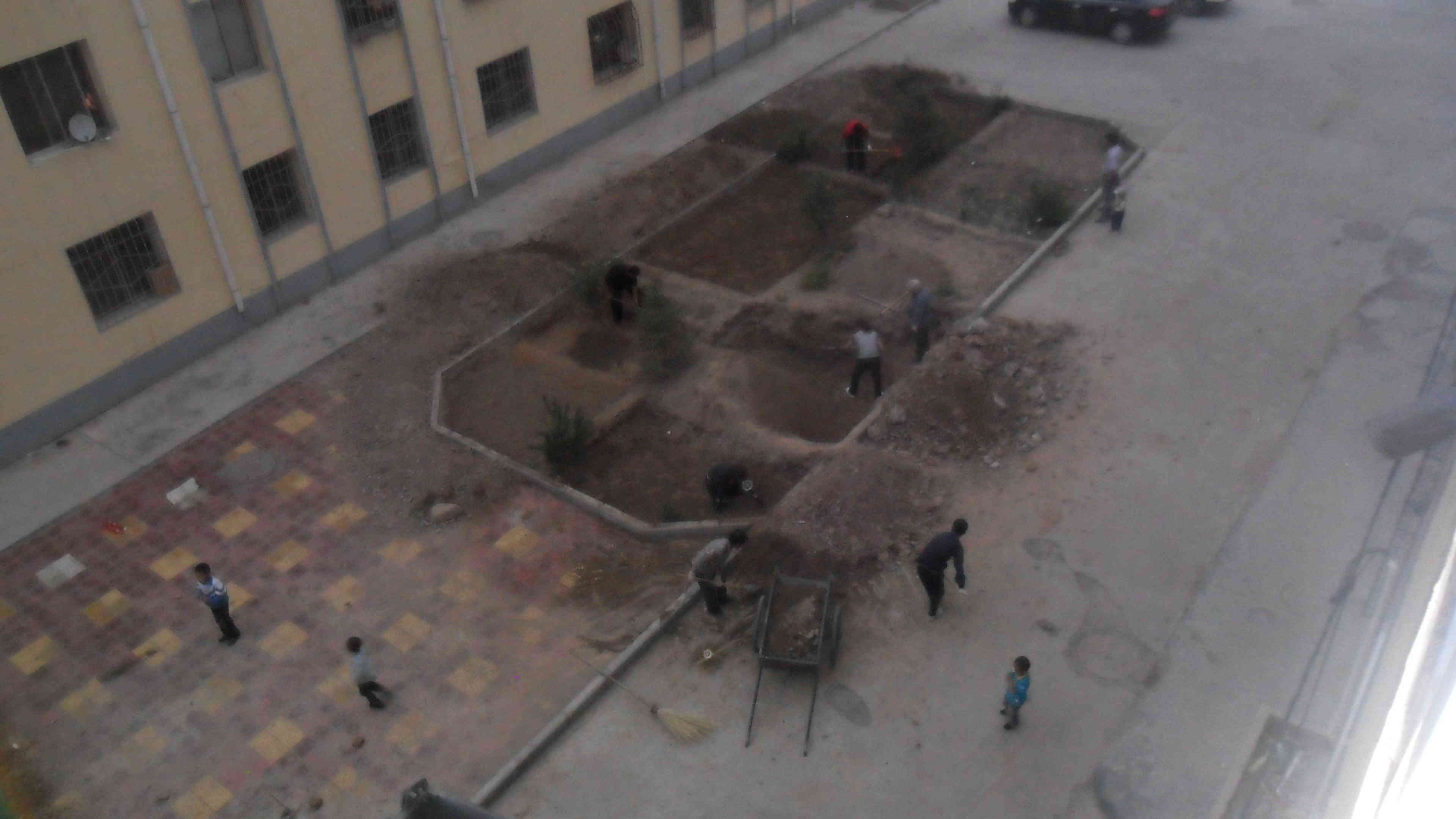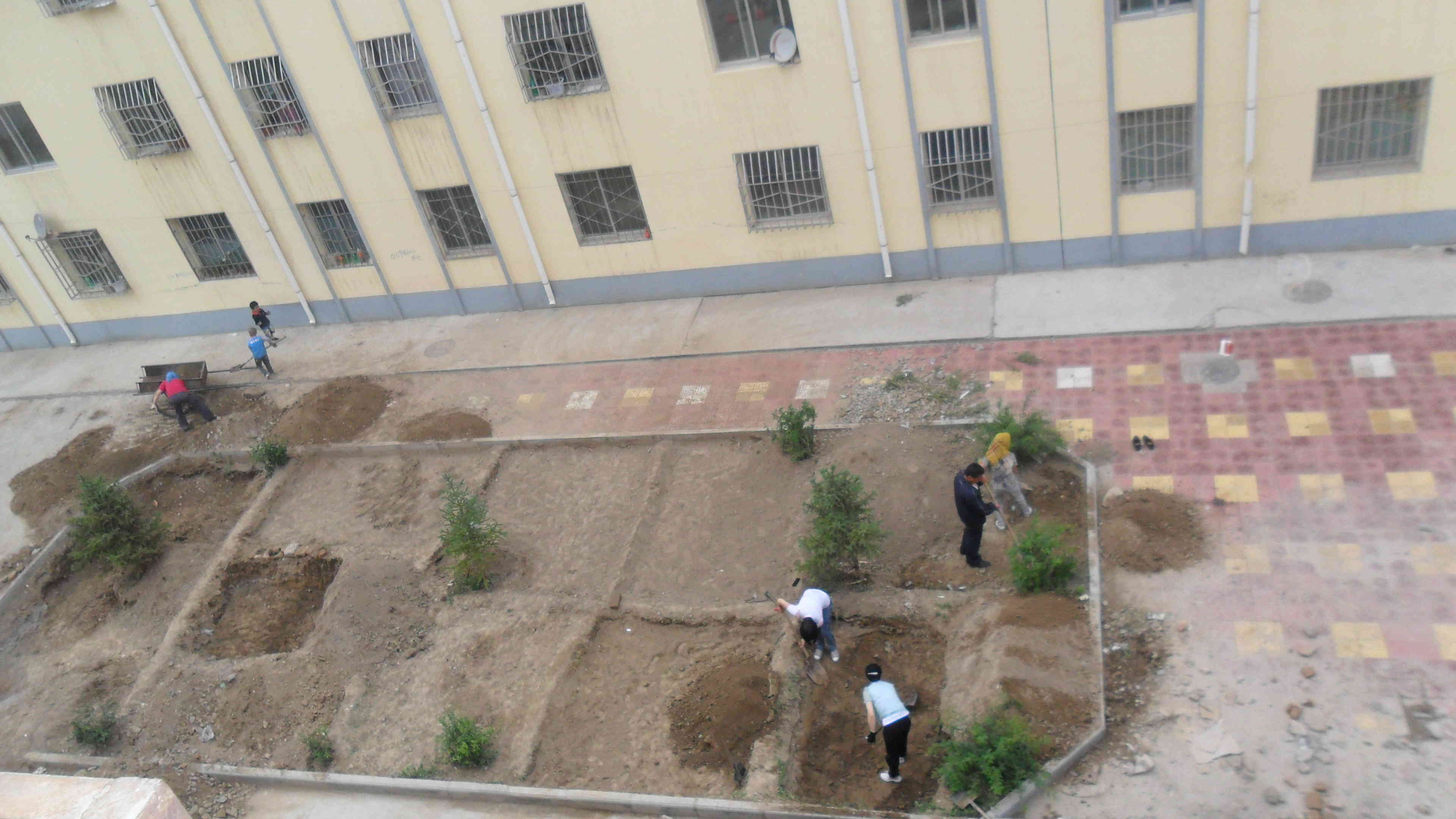 可能是因为受了前楼的影响吧!我们楼上的居民也是踵踵欲动啊!目标再转移到另一边的窗外,瞧!邻居们又一次忙得七上八下,他们也想种点疏菜。我爸正累得气喘吁吁,我妈妈忙得都不知道我正在窥伺她,哈哈!虽然累点,但心里却美滋滋的,因为再也不用吃打农药的疏菜了。苦中带甜,这就是生活情趣。