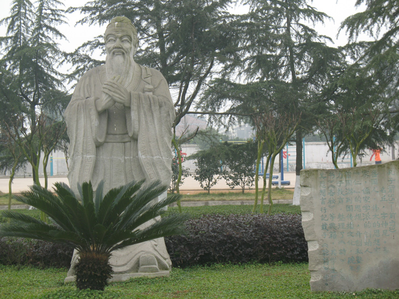 一踏进西来学校,你就会看到广场两旁两座巨大的人雕像,一位是我们古代伟大的教育家孔子,而另一位也是我国古代教育家——蒲江名人魏了翁。一股浓郁的文化气息扑面而来,使人神清气爽。