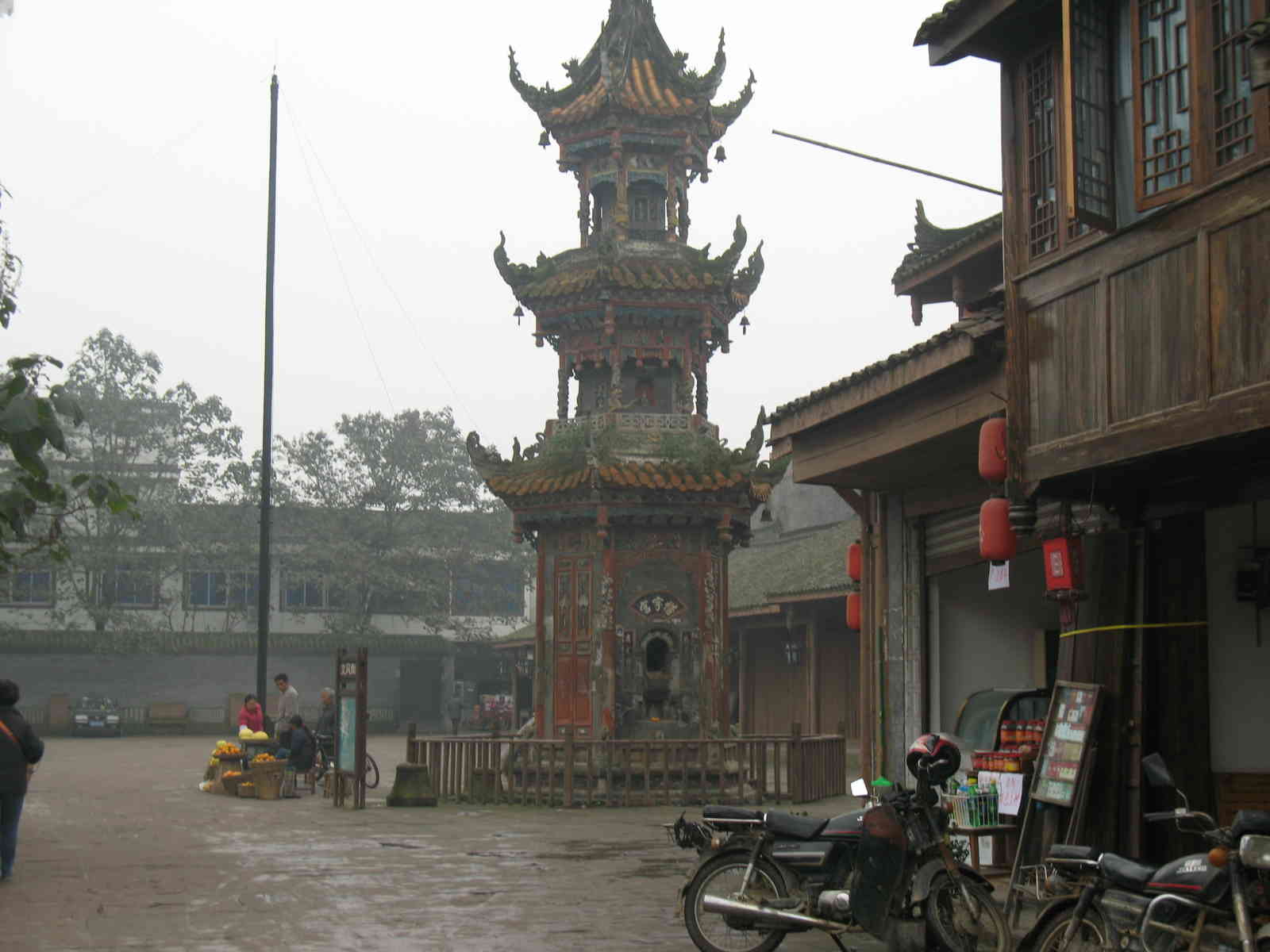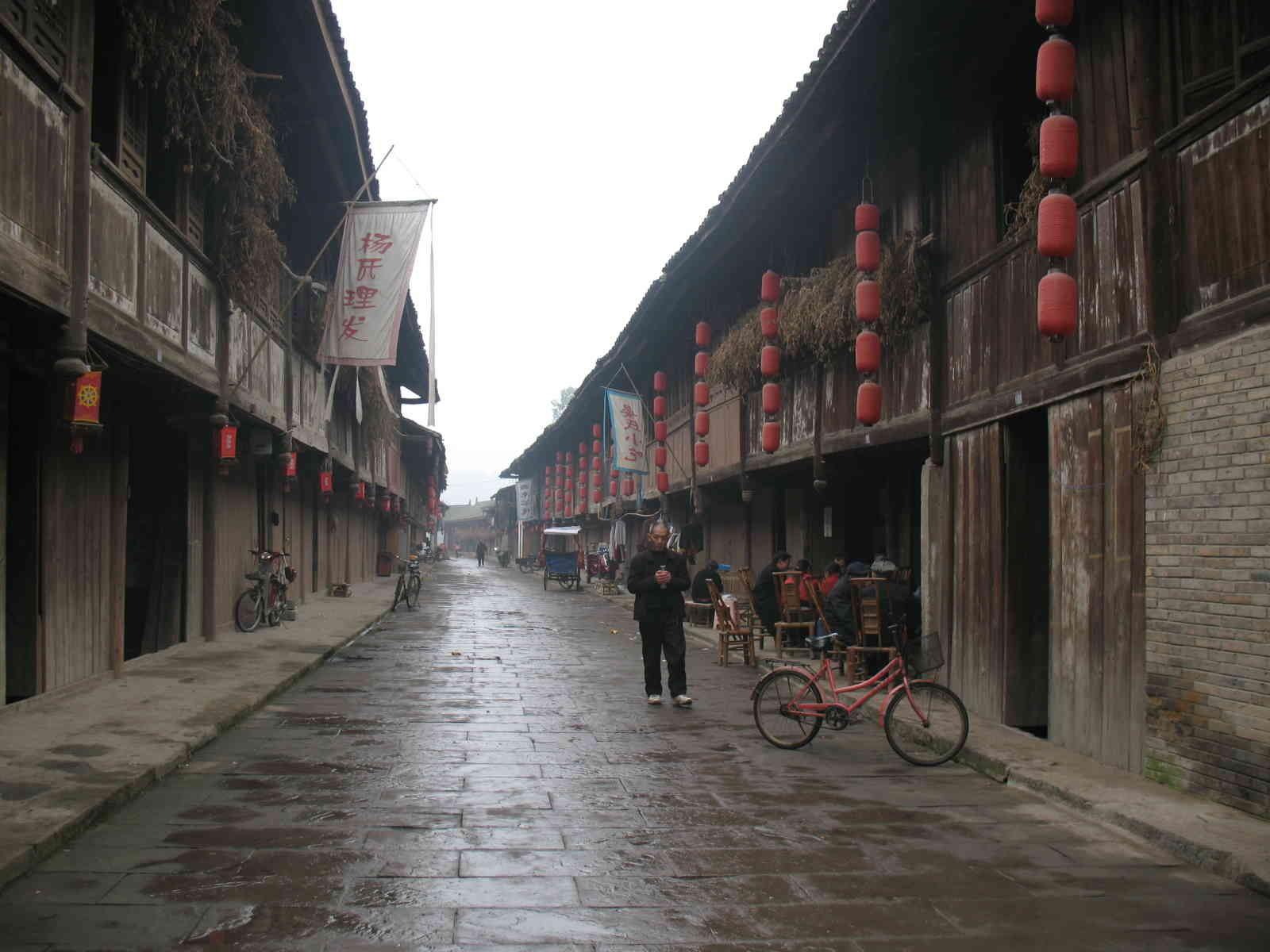 古街也给古镇添加了不少古的气息。古街全是由一块块的石板铺成,走在上面感觉就象回到了古代。一到赶集的日子,古街可热闹了。古街两旁的古店都竖起了招牌,那招牌有别有艺术,做得跟古代的像极了。古店的名字也透露着一个"古"字,比如旅馆在这叫做"客栈"等等。